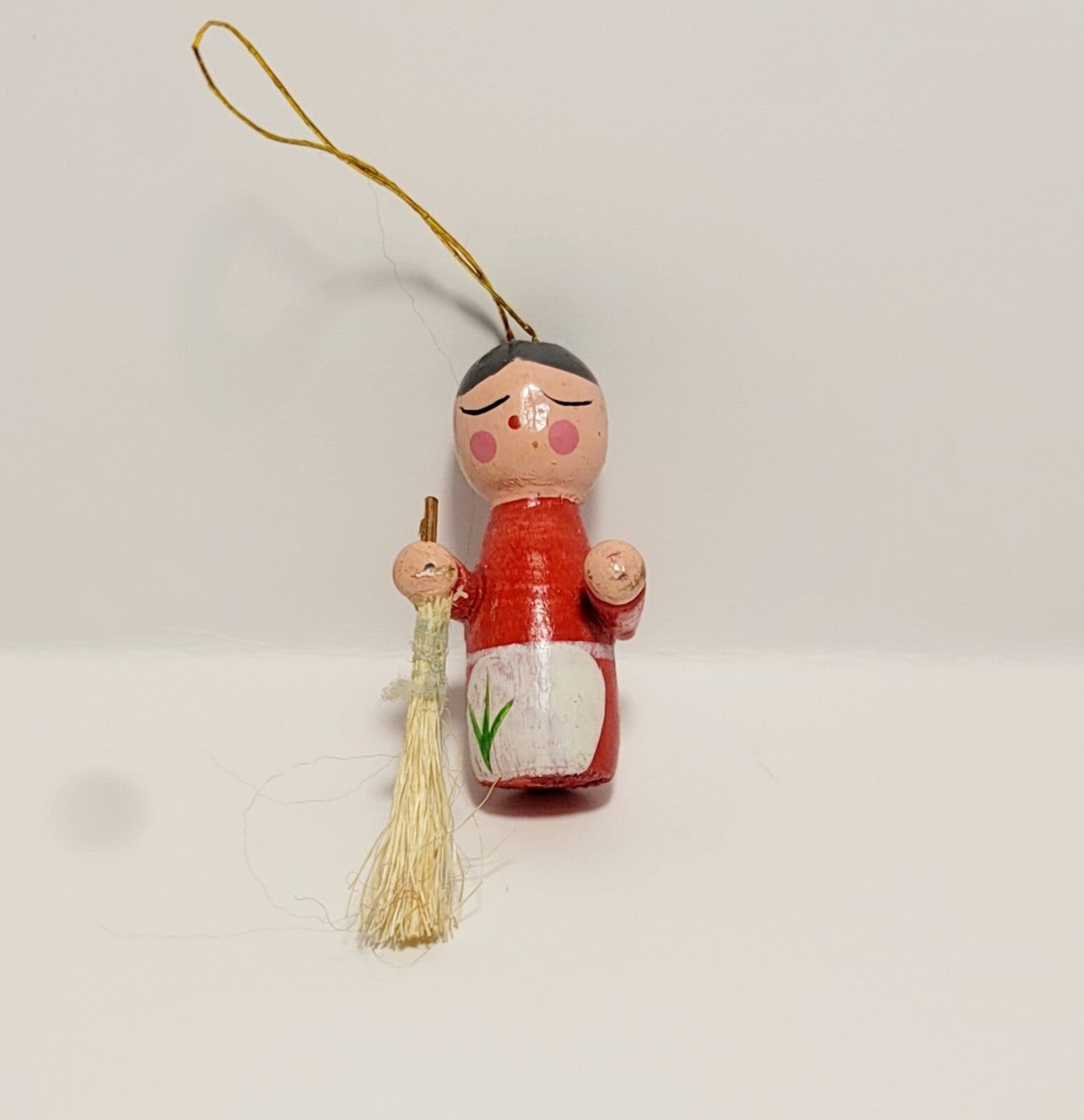 - Vintage 1960s Japan Christmas Ornament Wife Broom 1.5" Handmade Hand Painted