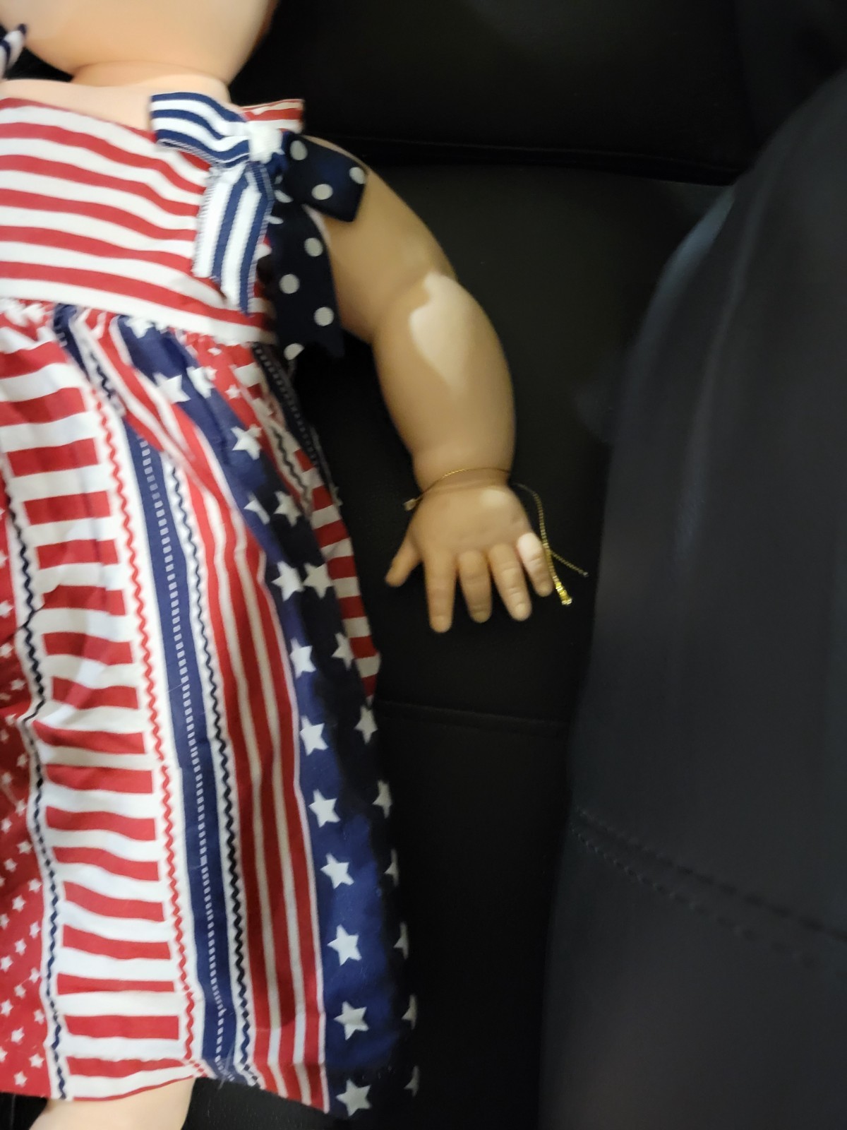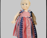 The product is a vintage 1966 Cameo Kewpie doll in a 24-inch size, dressed in an Americana outfit. This antique doll features brown hair, brown eyes, and a light complexion. Made of vinyl, this baby doll is a classic piece from the 1960s, perfect for collectors or those who appreciate retro Americana fashion. The doll is one piece and comes as originally manufactured without any personalization. Head, Arms and Legs are jointed and strung together to the body.