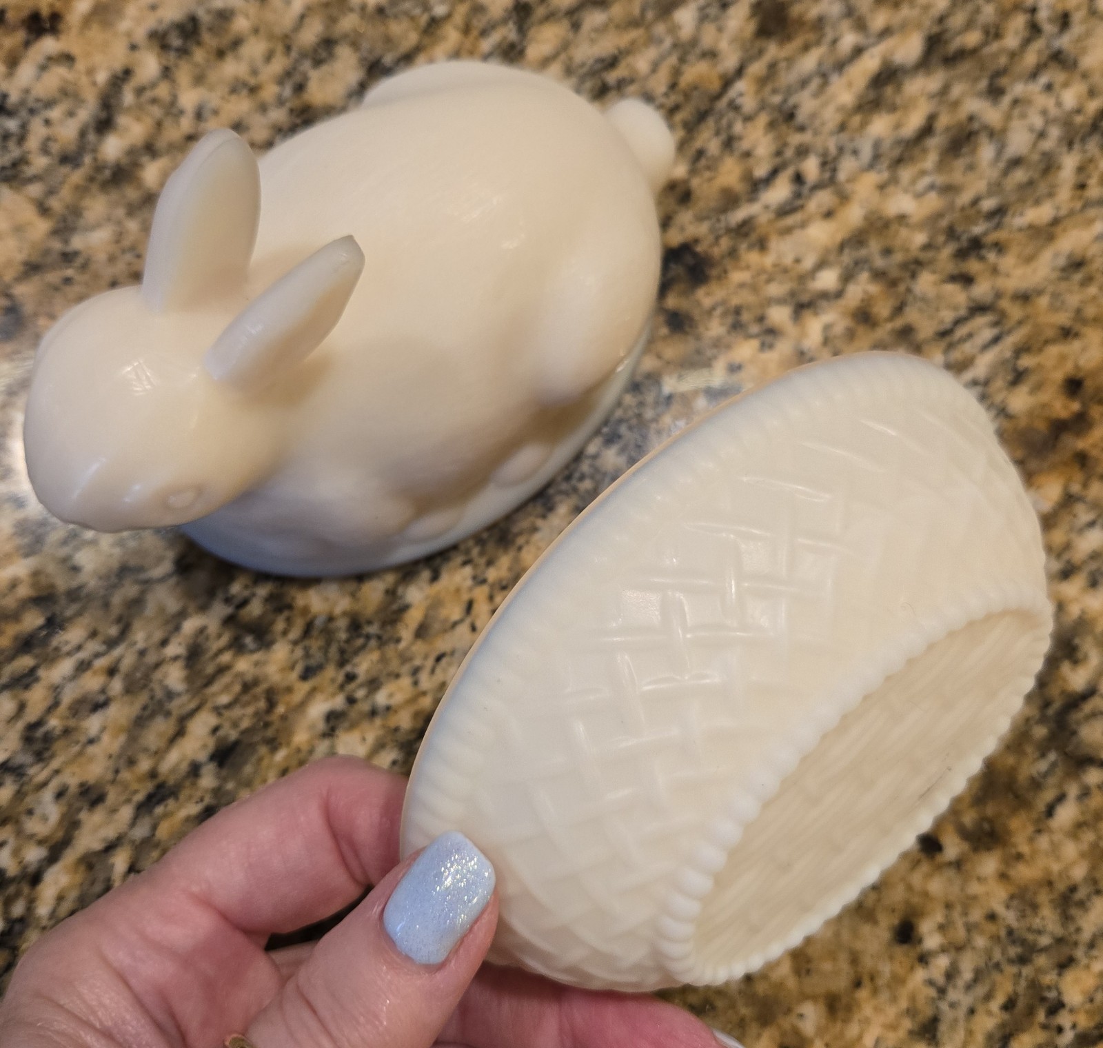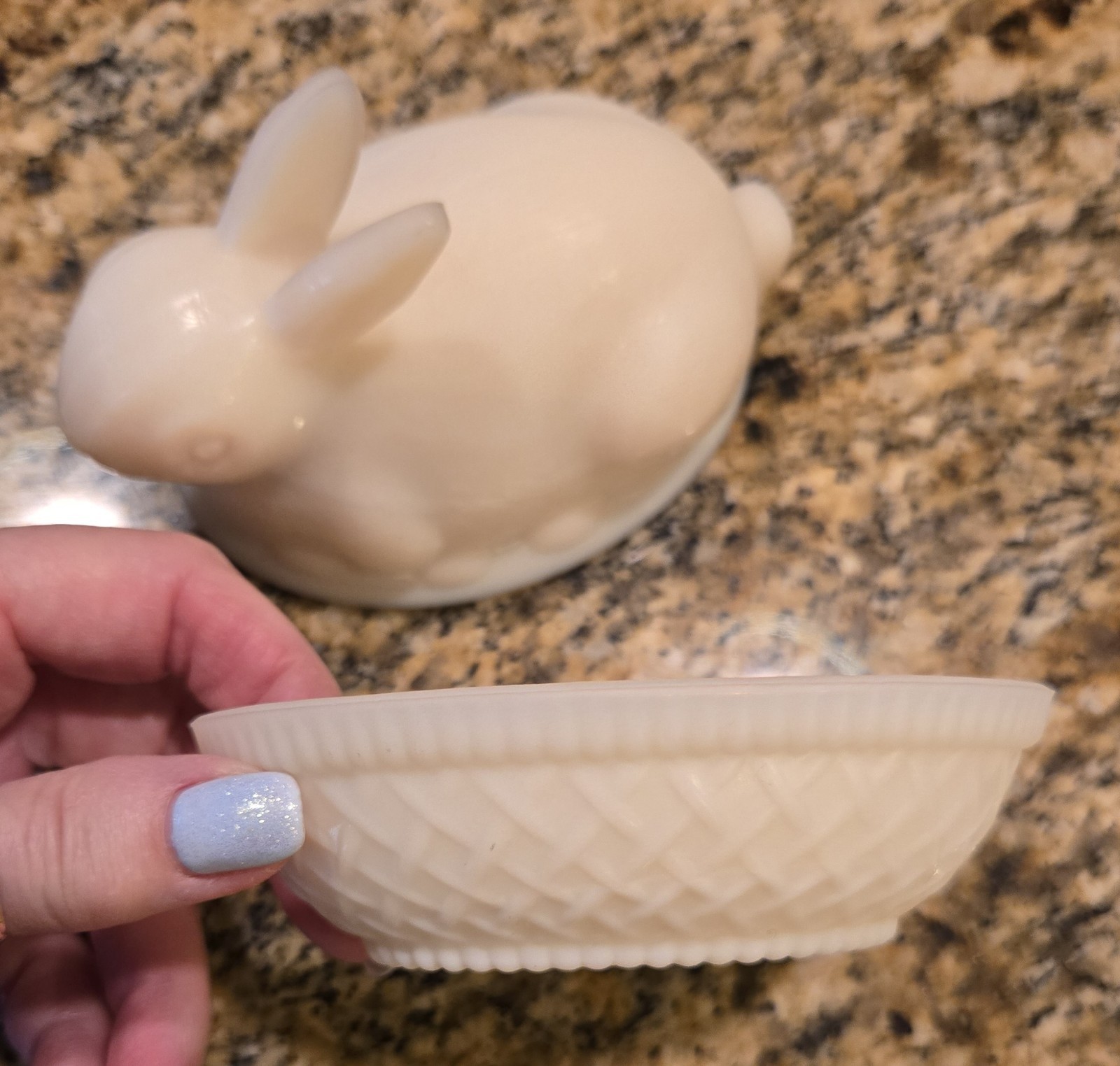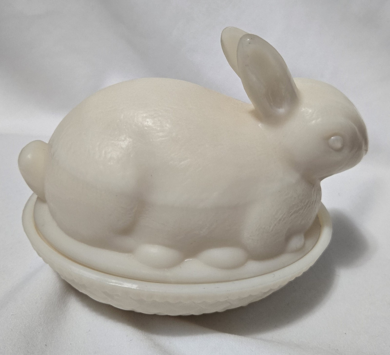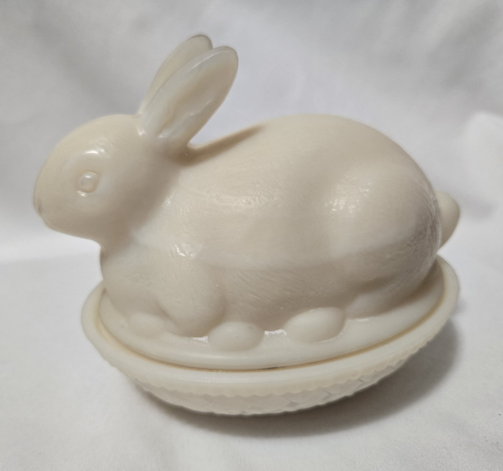 Beautiful Vintage 1973 Imperial Glass USA Custard Glass Bunny on Basket Trinket/Candy Dish. Hallmark on interior of basket. Great gift idea!