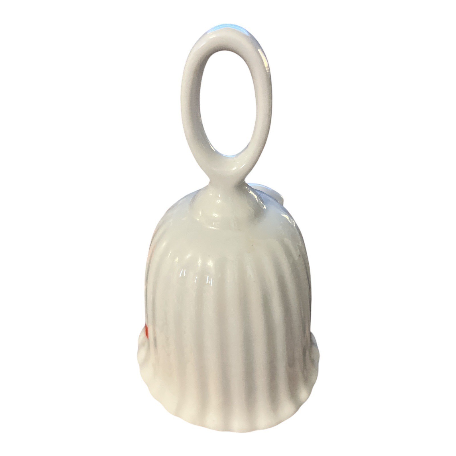 This charming vintage Christmas bell features a raised Santa figure holding a candy cane, framed by a red ribbon and festive holly design. The white ceramic bell has a fluted texture and a loop handle, with a classic clapper inside. Marked "Made in Taiwan," this piece likely dates to the 1980s and makes a nostalgic addition to holiday decor or a festive bell collection.