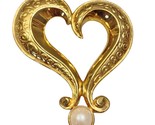 Vintage 1980s MCM Signed Avon Gold Tone Faux Pearl Ornate Etched Scrolling Details Open Swirl Heart With Faux Pearl Drop Accent Brooch Pin