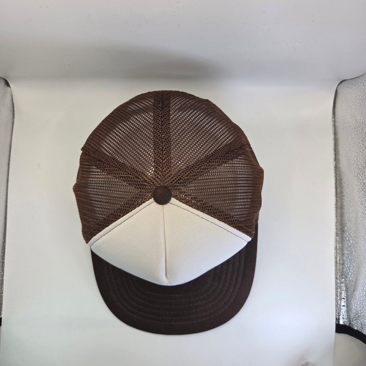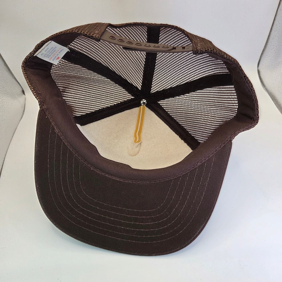 Vintage 1986 Lindsay Bros. Co. 100-Year Anniversary trucker hat by Yupoong. Features a foam front panel with anniversary print and brown mesh back. Adjustable snapback closure. Made in Korea from a cotton/poly/nylon blend. Pre-owned in very good condition ? foam front remains intact with light signs of age.