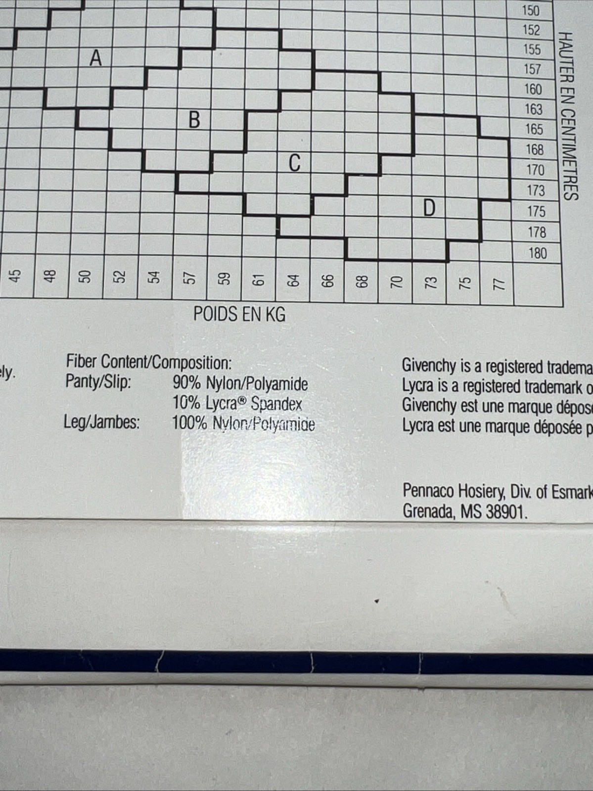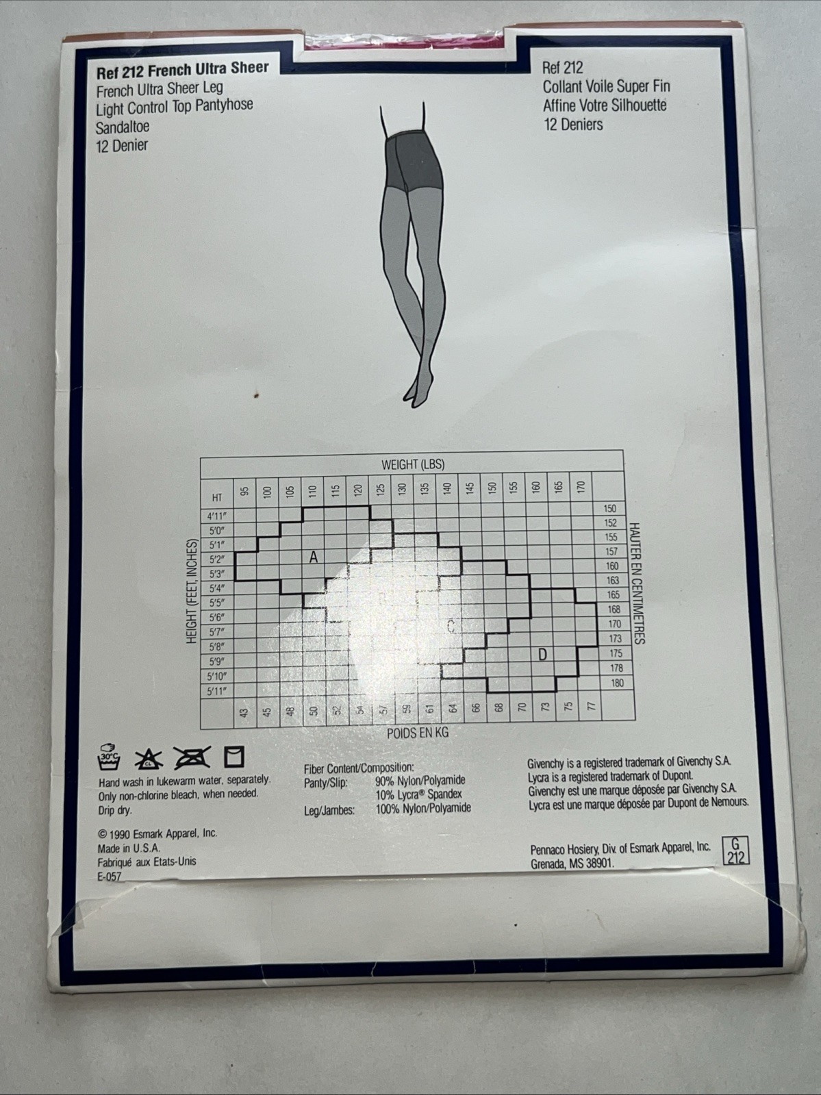 The product is a vintage pair of 1990 Givenchy French Ultra Sheer Leg Pantyhose in a light control top with a begonia color. Made of nylon, these pantyhose were produced in the United States during the 1990s. With a regular size type and hosiery size of C, they are designed for everyday wear. The Givenchy brand adds a touch of luxury to these classic pink pantyhose, making them a unique and stylish addition to any vintage lingerie collection.