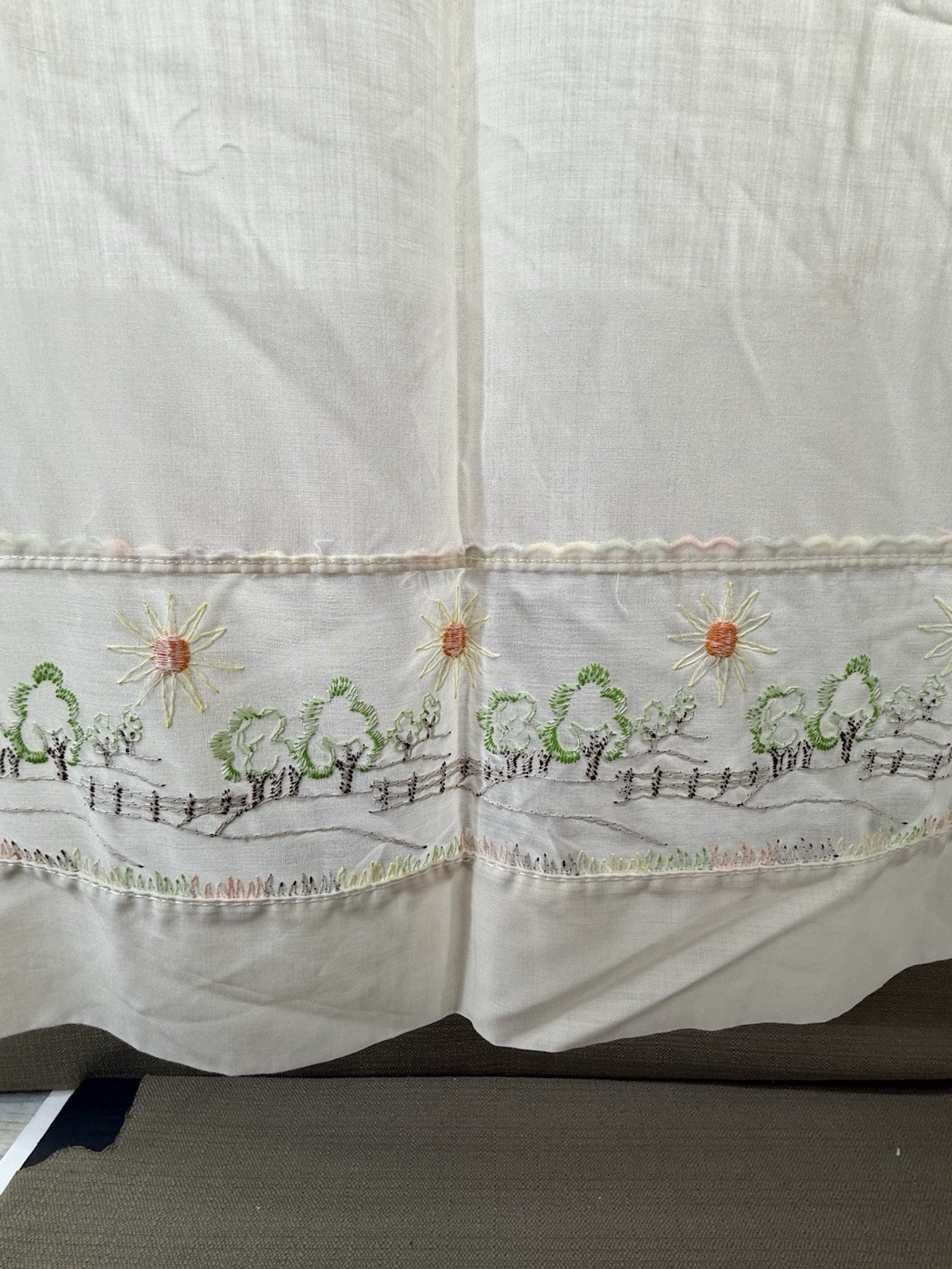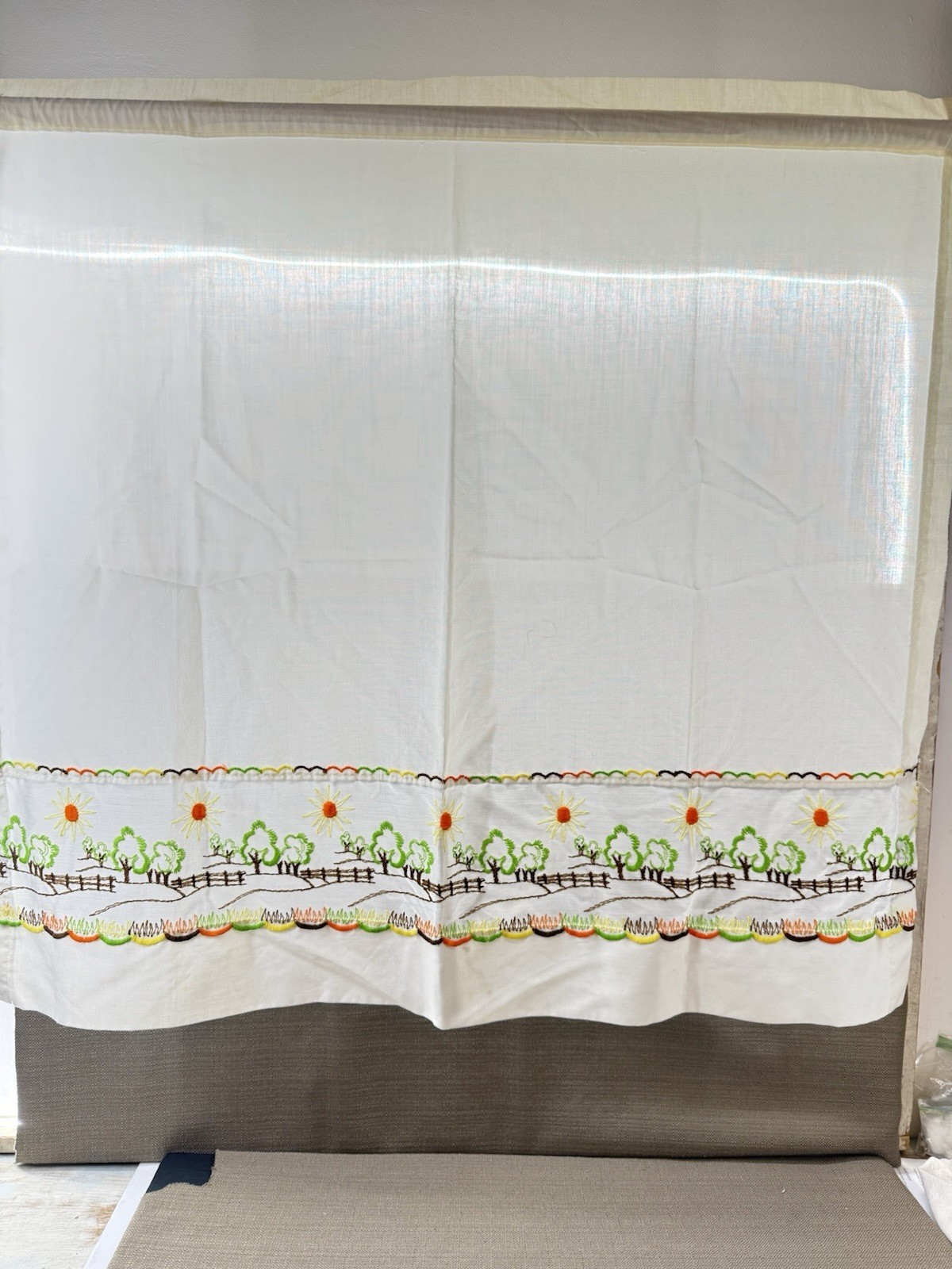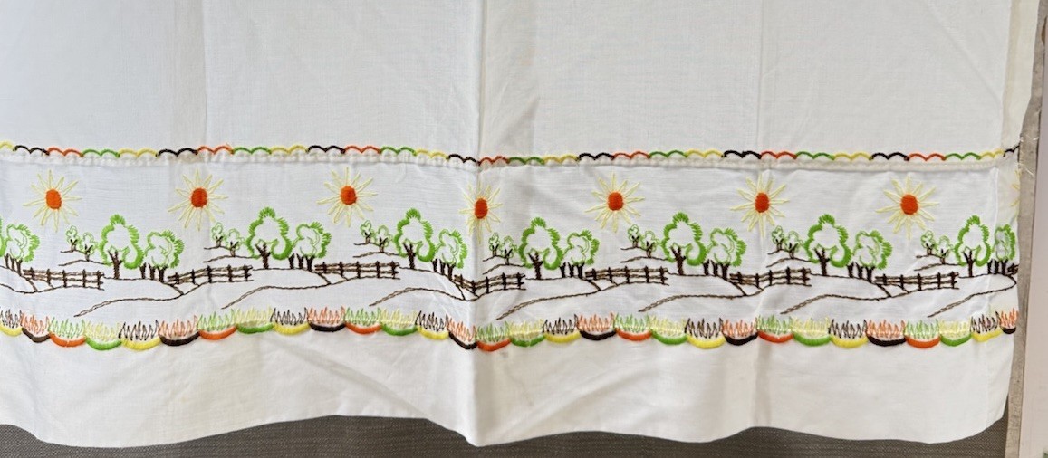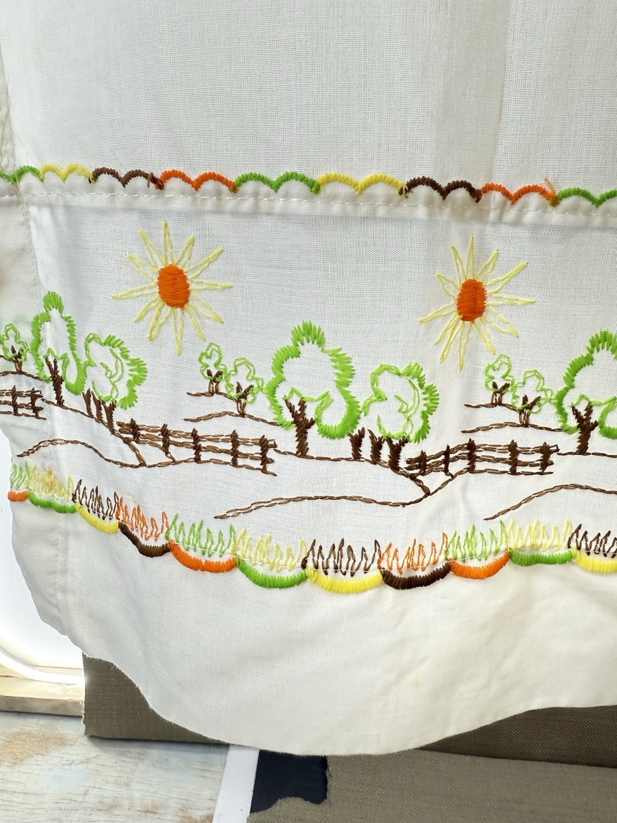 Beautiful vintage embroidered curtain panel featuring a charming country landscape design with bright suns, green trees, fences, and colorful scalloped edging. The detailed hand embroidery adds warmth and nostalgia, perfect for a retro kitchen or farmhouse-style space.