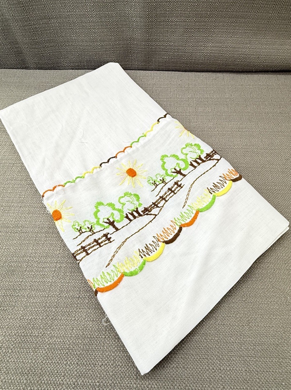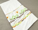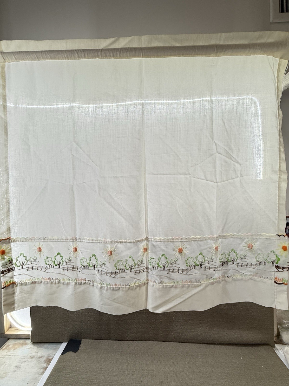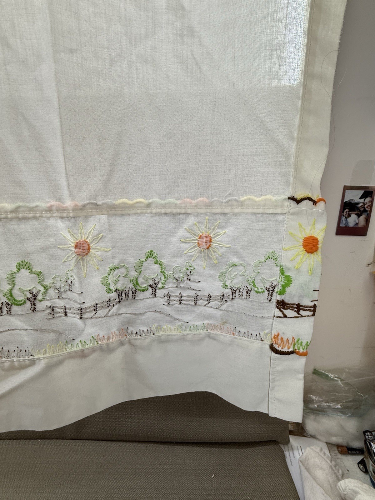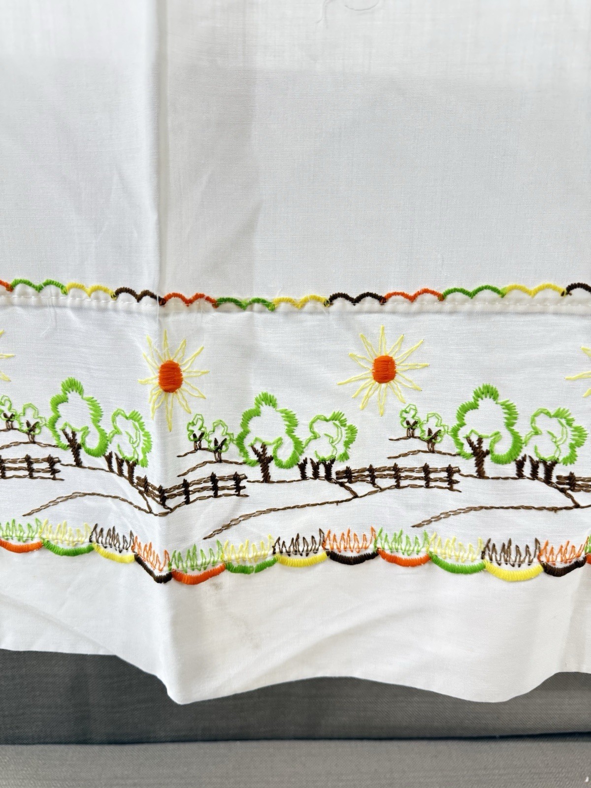 Beautiful vintage embroidered curtain panel featuring a charming country landscape design with bright suns, green trees, fences, and colorful scalloped edging. The detailed hand embroidery adds warmth and nostalgia, perfect for a retro kitchen or farmhouse-style space.