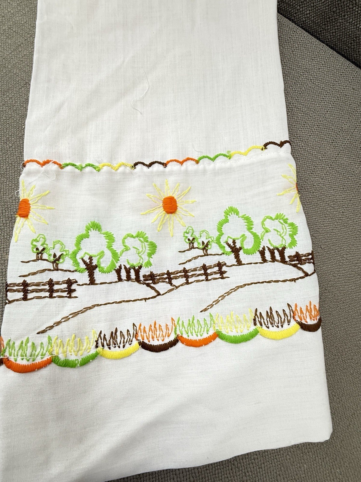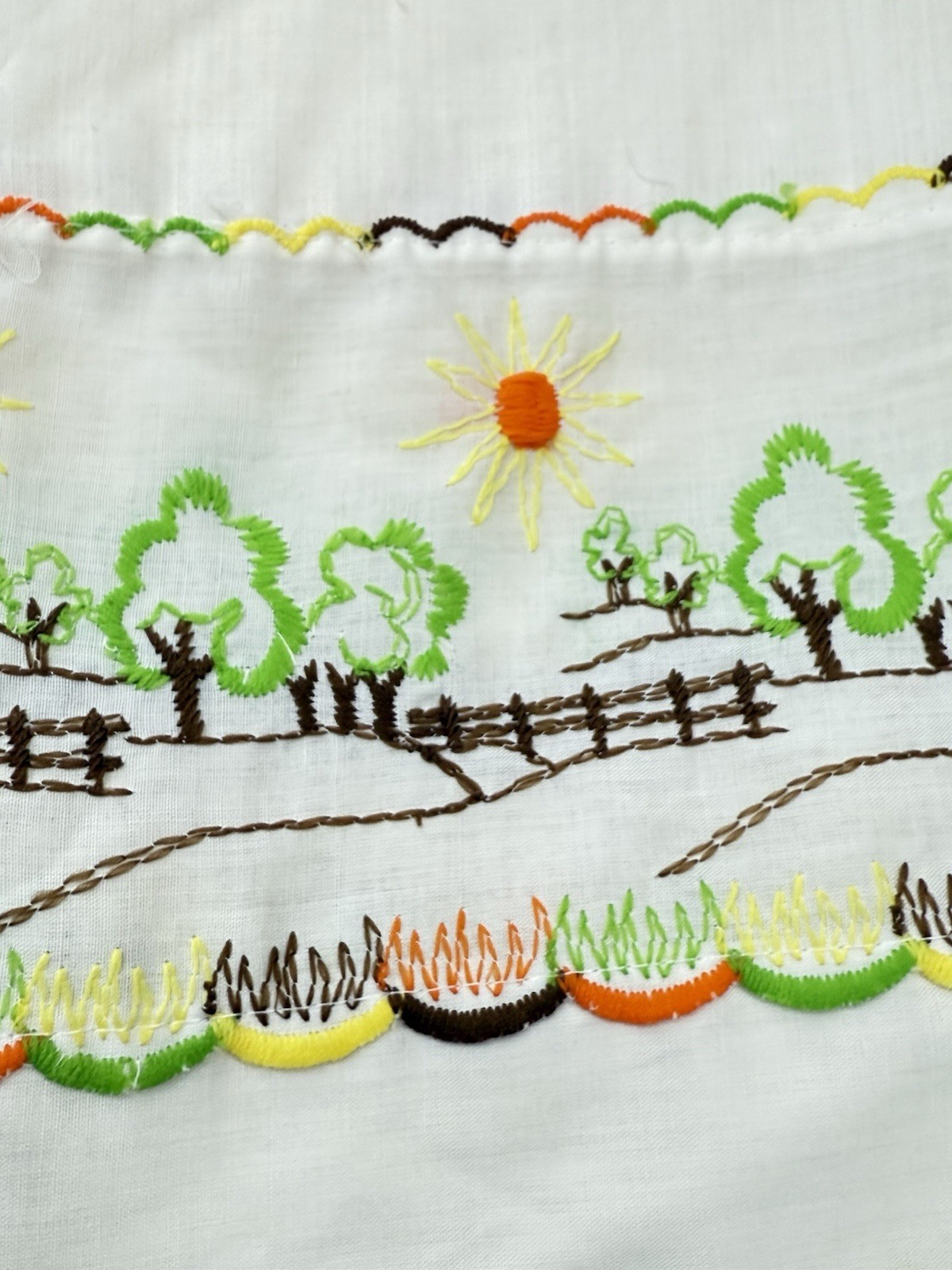 ? Design: Hand-embroidered countryside scene with sun, trees, and fences