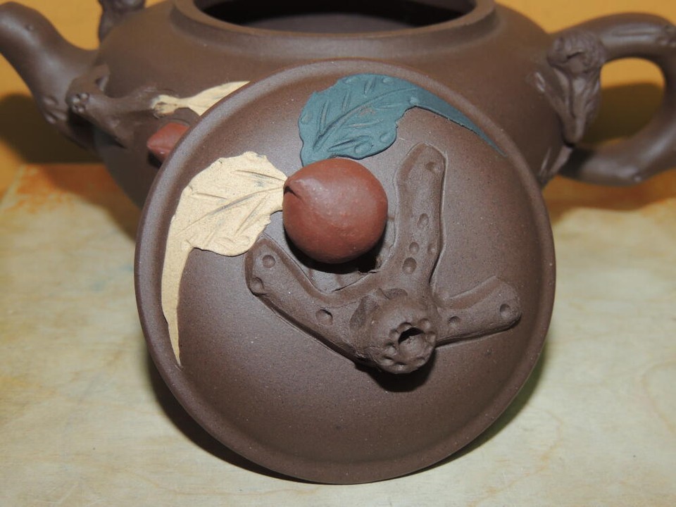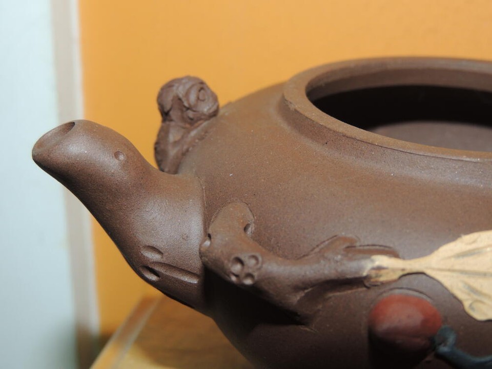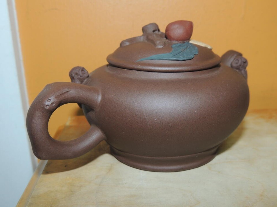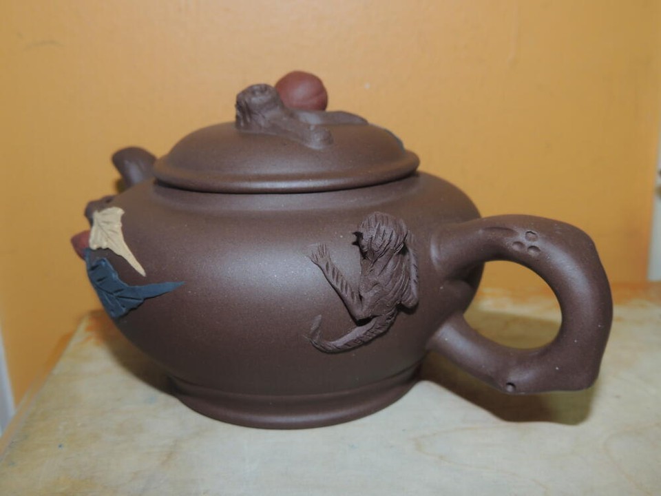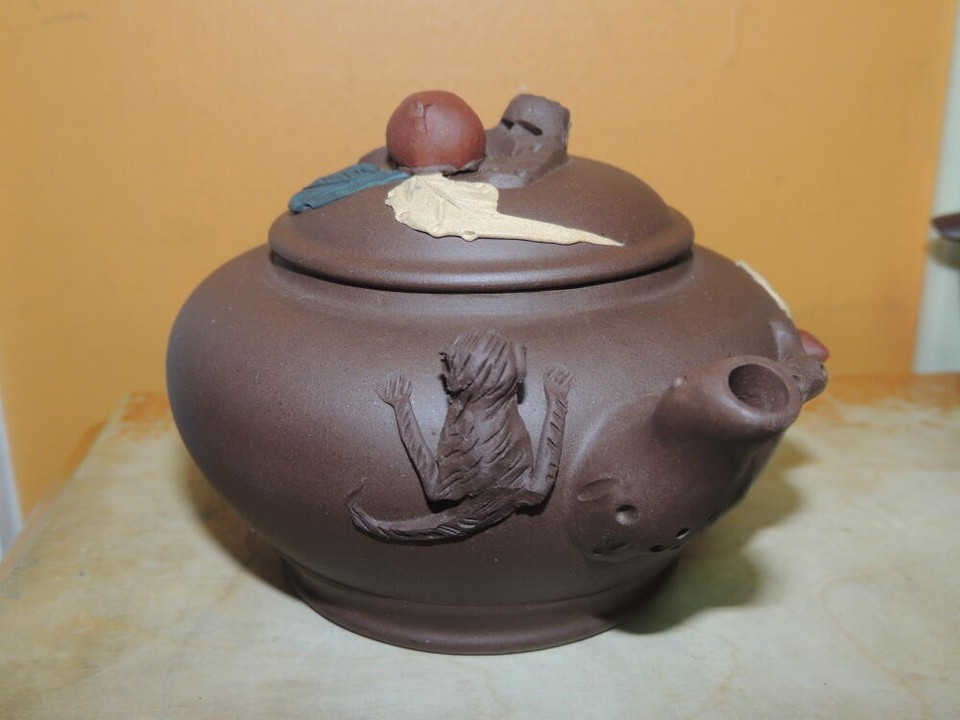 - Vintage 3.25" Yixing Zisha Teapot Brown carved monkies fruit Vintage asian mark