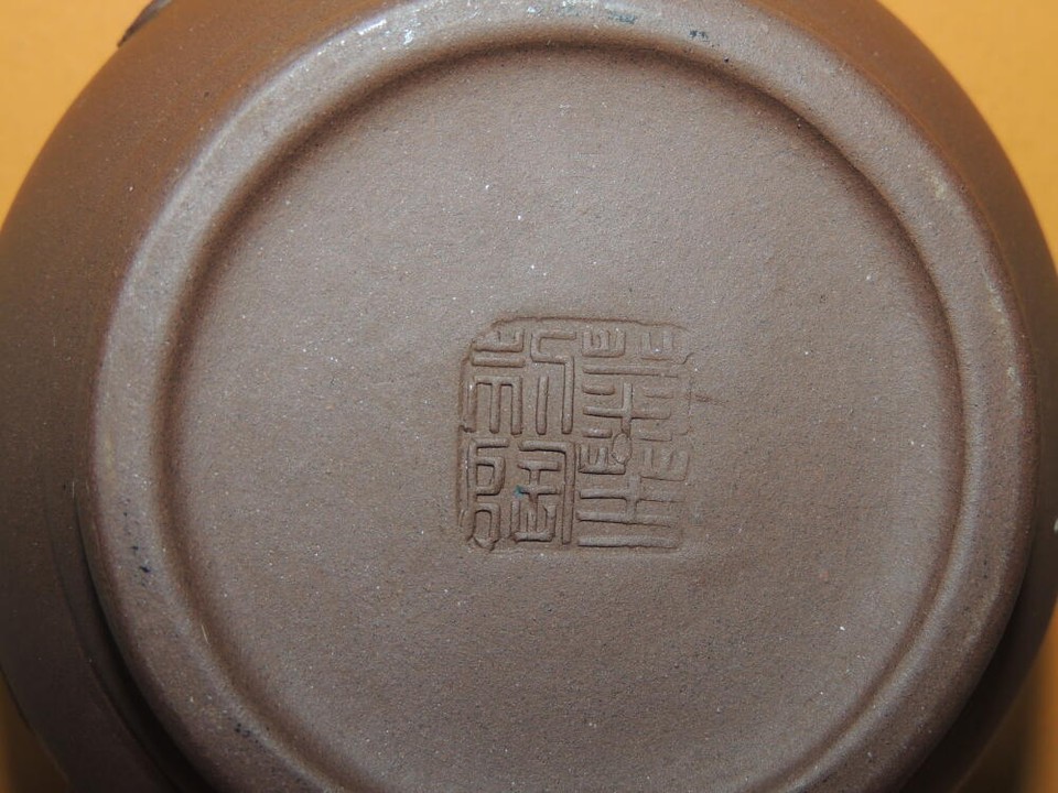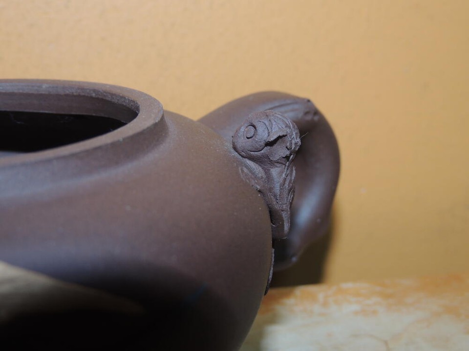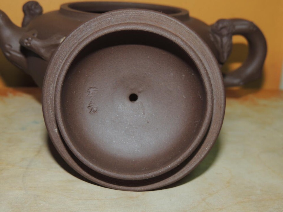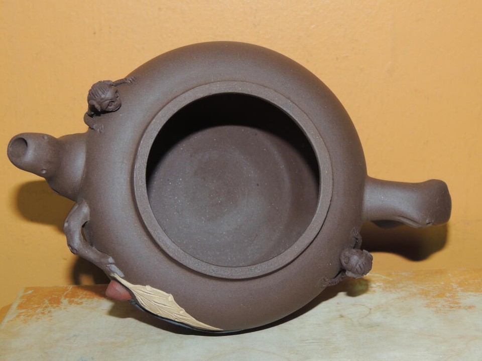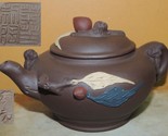 - Vintage 3.25" Yixing Zisha Teapot Brown carved monkies fruit Vintage asian mark