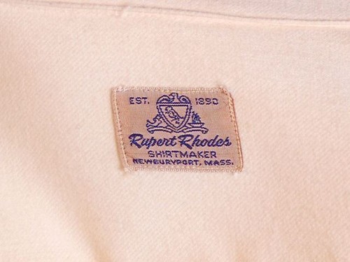 A superb example of mid-century bespoke tailoring, this vintage Rupert Rhodes shirt is a rare and refined find. Made from lightweight unique linen-wool blend, the shirt features a classic straight hem, double stitching, and two front breast patch pockets. The craftsmanship speaks to the quality of the Newburyport, Massachusetts shirtmaker. Adding to its unique character, the initials "CH" are elegantly embroidered on the front, a personalized touch from its original owner, a 1950s-60s company executive. In excellent condition, this garment is a timeless piece of American menswear history and a sustainable choice.