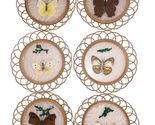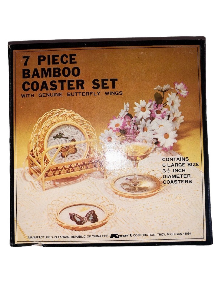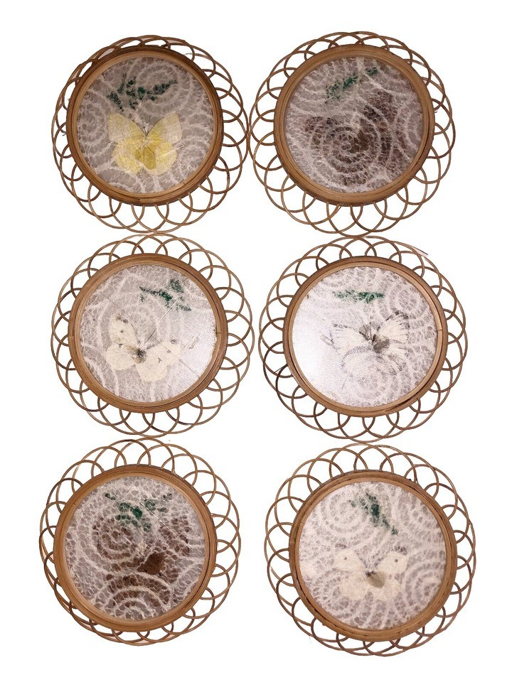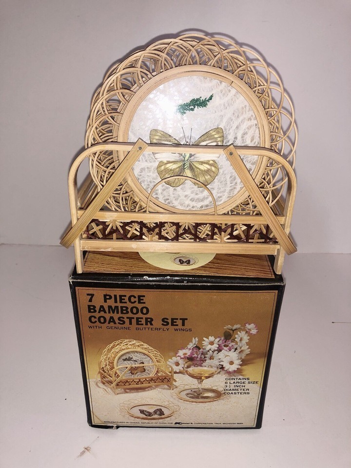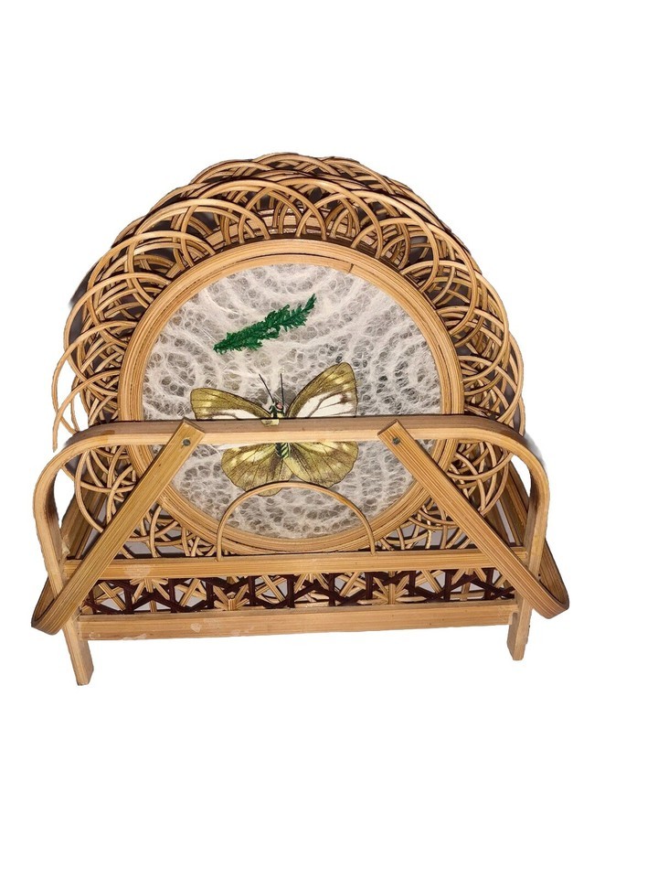 - Vintage 6 Bamboo Real Butterfly Wings Coasters Wicker Caddy 70's BOHO Set Rattan