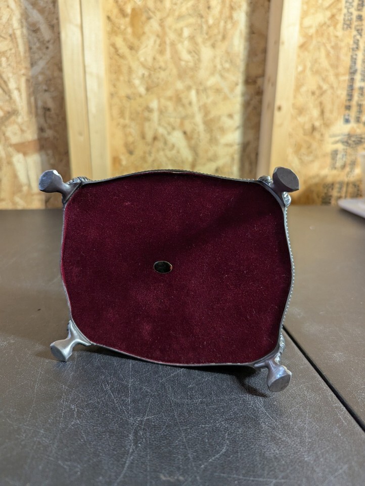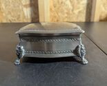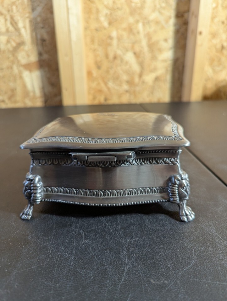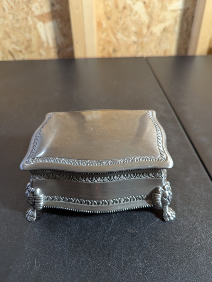 This vintage brushed pewter 6" Victorian jewelry box is a charming collectible piece originating from China. It holds a beautifully crafted design typical of the Victorian era, making it a unique and decorative addition to any vanity or display. Perfect for storing small trinkets or jewelry, this box exudes a classic and elegant appeal that is sure to be a beloved item for any collector or enthusiast of vintage accessories.