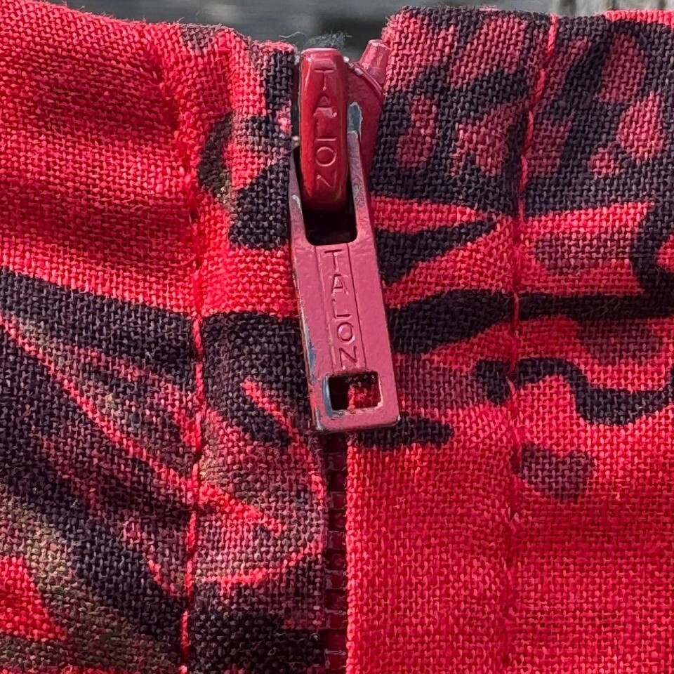 cotton fabric with gold sleeve trim, metal Talon zipper, red background with black and brown print of ocean waves and islands a vegetation