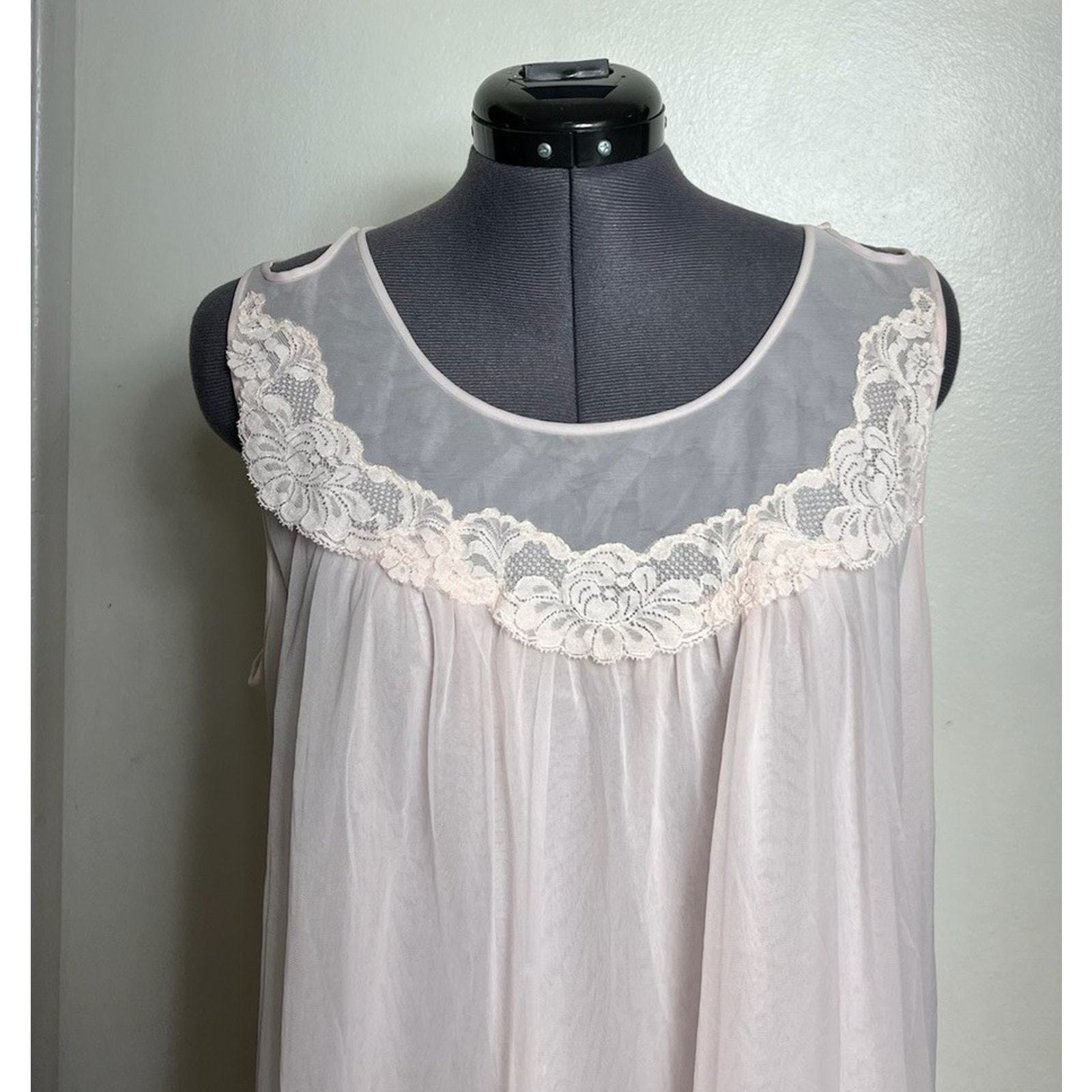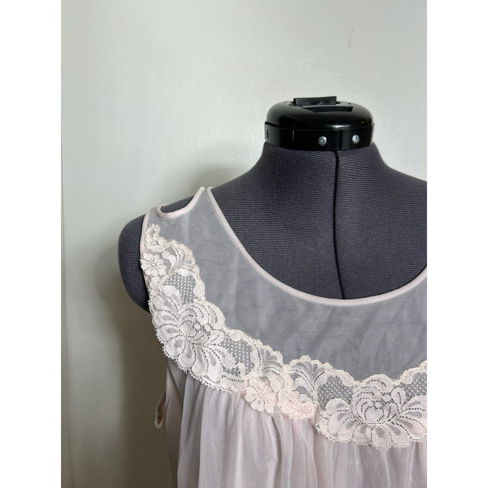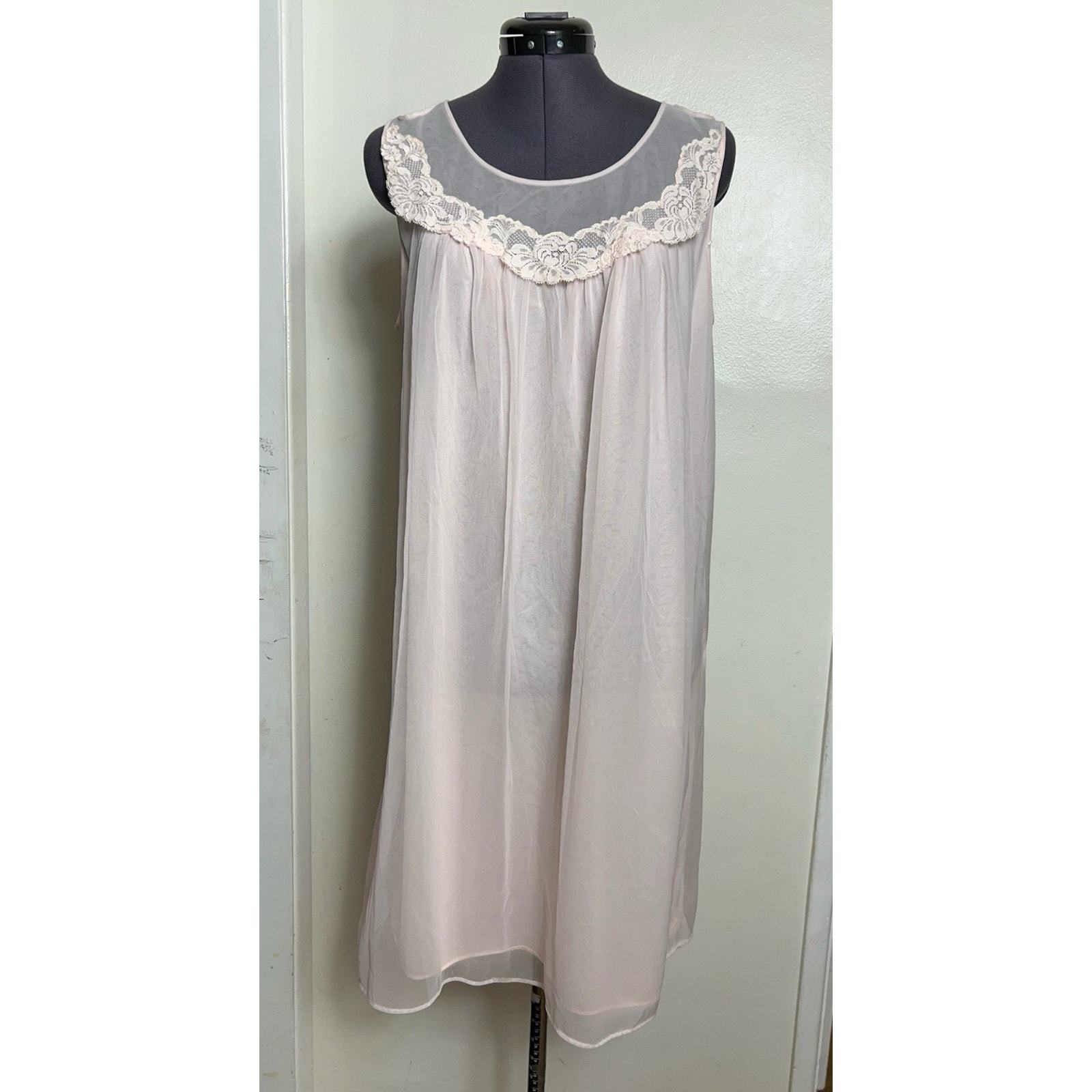 - Vintage 60s Pink Nylon Chiffon Nightgown Lace Sheath Slip Lingerie Dress Sz L