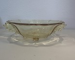 This vintage 70's yellow glass footed fruit bowl is a stunning piece of Mid-Century Modern decor. Made in Indiana, USA, this large 11" bowl features a charming oval shape with a fruit pattern, perfect for all occasions. The vibrant yellow color and original unmarked brand add to its retro appeal. Ideal for entertaining or everyday use, this glass serving bowl is a unique and stylish addition to any home collection.