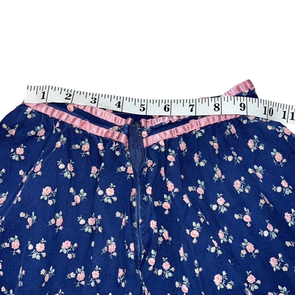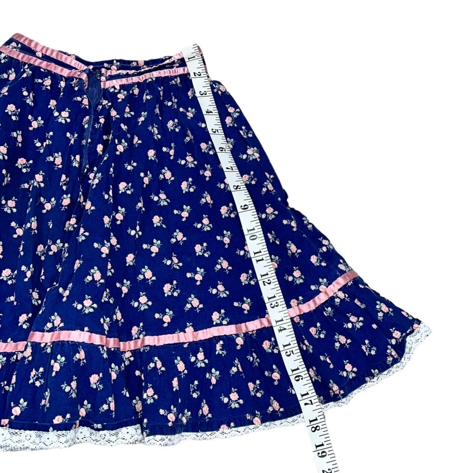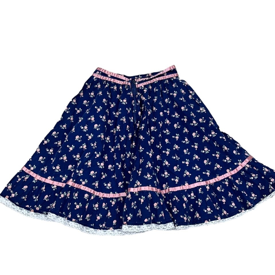 This vintage 70s Gunne Sax style women's prairie skirt features satin lace trim and a charming floral pattern. The piece exudes timeless elegance and effortless style, perfect for those who love retro fashion.