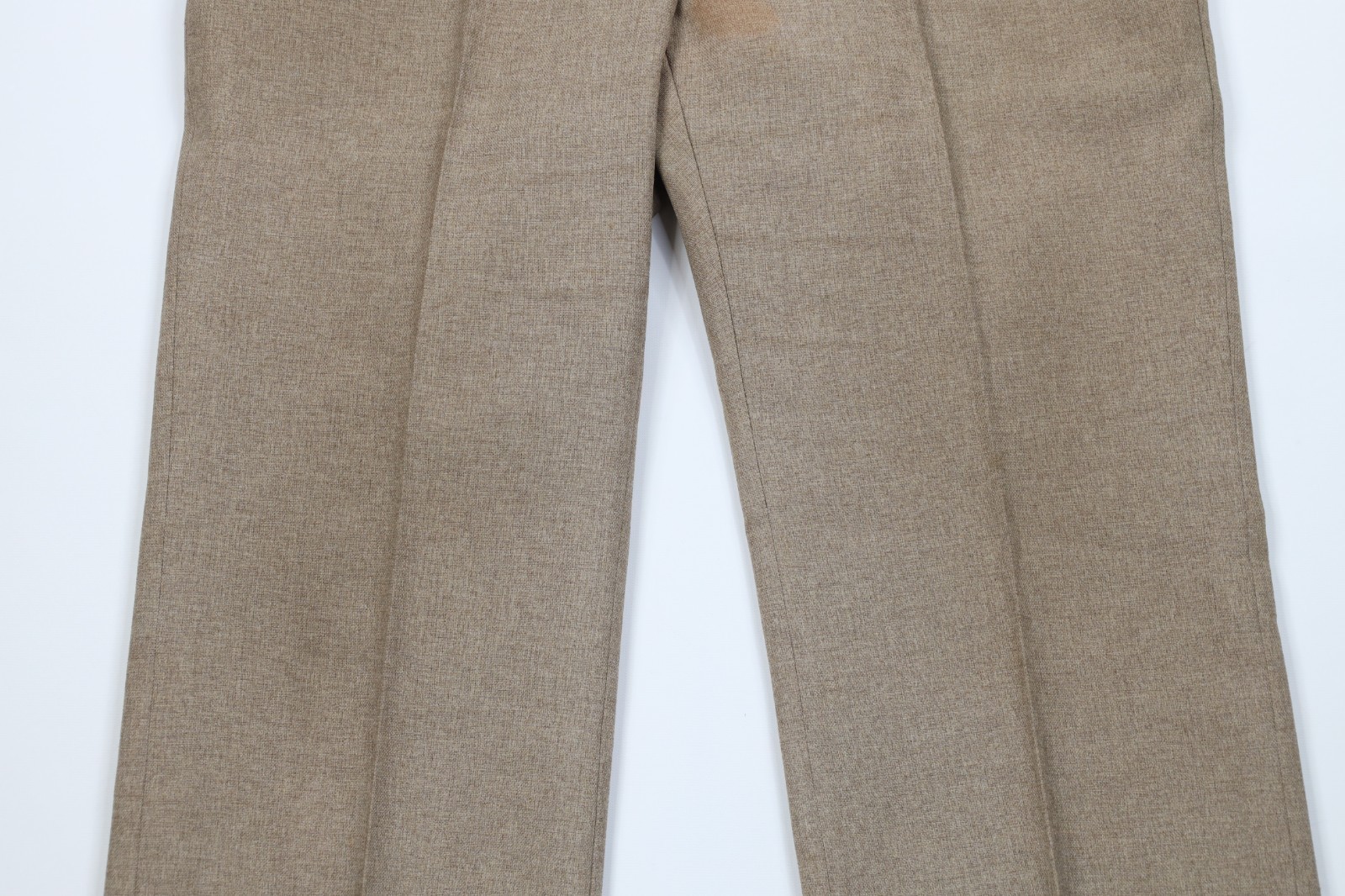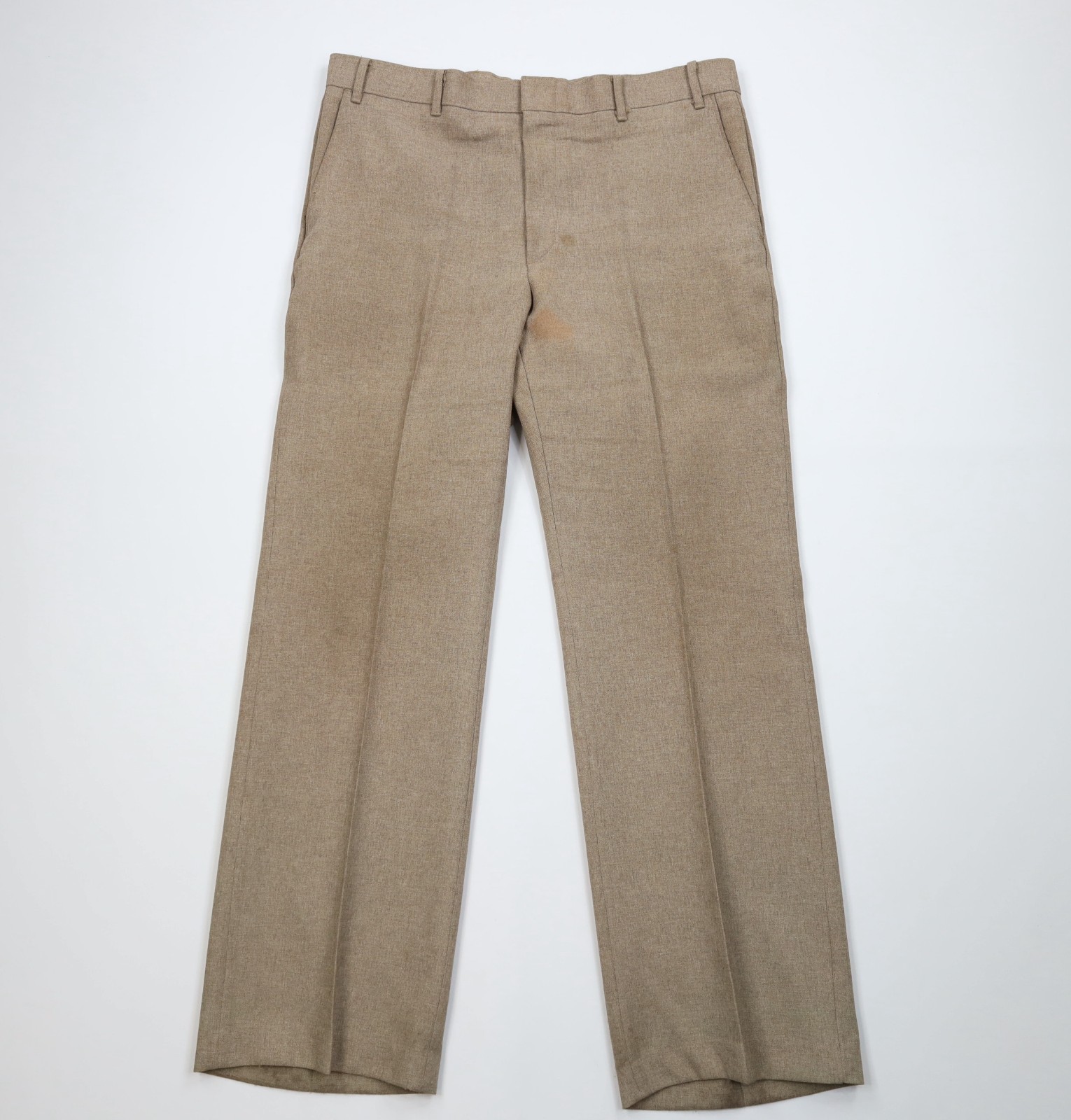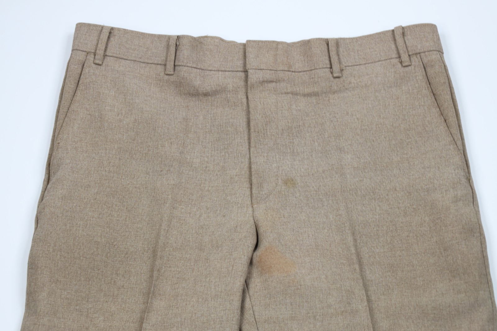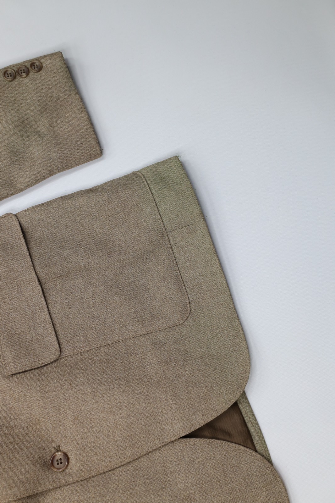 Jacket: stains front, back, inside, collar. Discolored/faded across shoulders. Vest: Blemishes front right, upper left. Pants: Blemishes throughout. Bleach stain front. Cuffs distressed.USA made