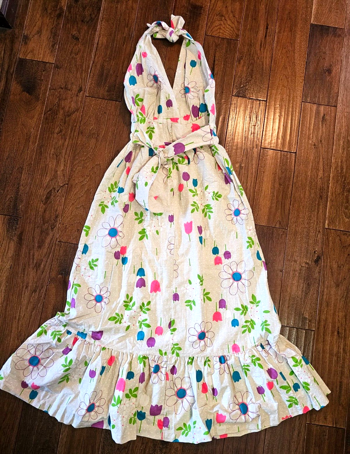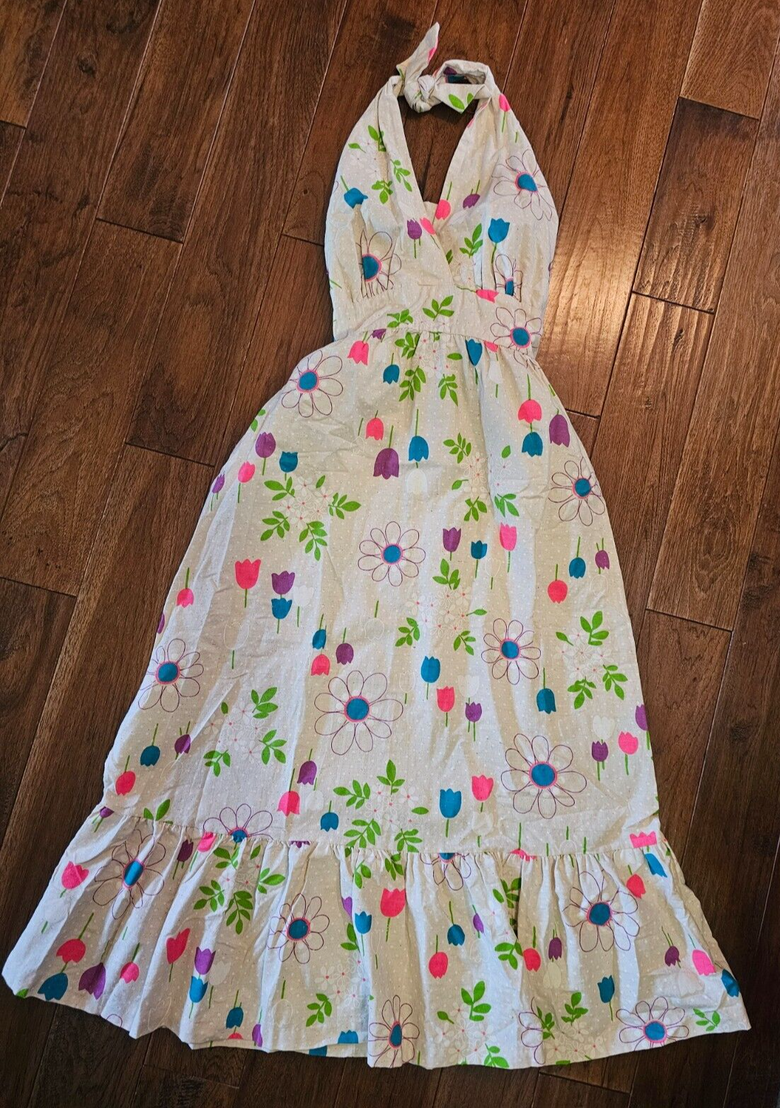 - Vintage 70s Maxi Dress Small Floral Print Halter Neck Pink Orange Blue