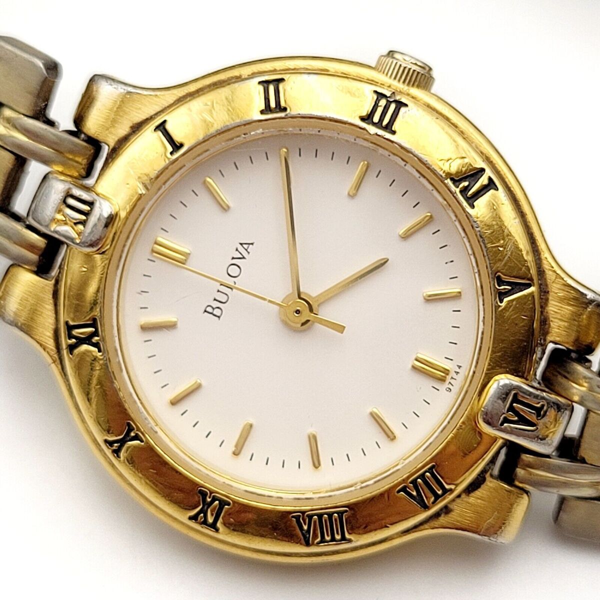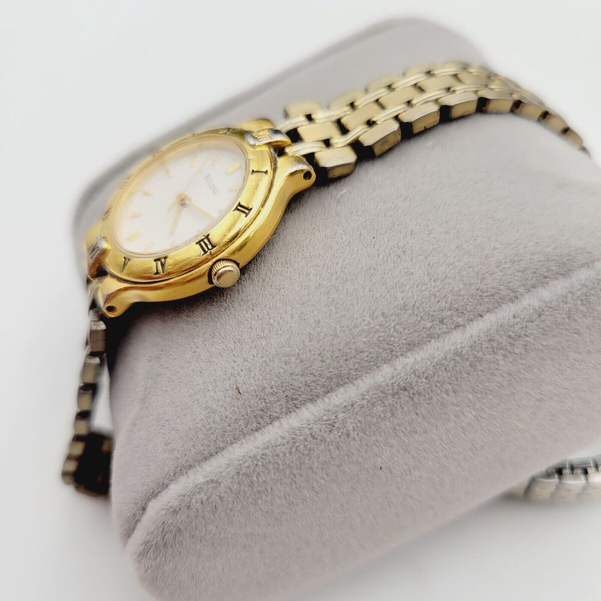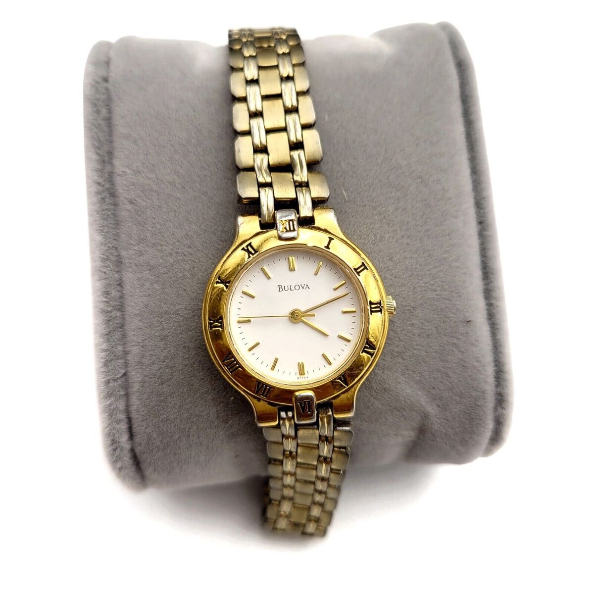 The Vintage 90's Bulova Quartz T9 Watch is a pre-owned women's wristwatch made in Japan. It features a round white dial with an analog display, gold bezel, and dark gold stainless steel band. The watch is water-resistant and has a brushed stainless steel case finish. It was manufactured between 1990-1999 and has a reference number of T9. The watch comes without papers or original box/packaging. It is a casual style watch with features such as water-resistance.