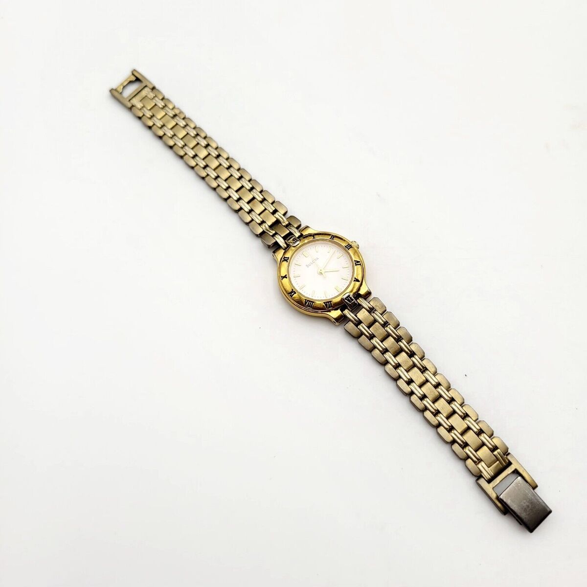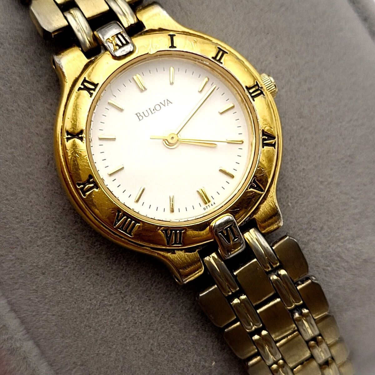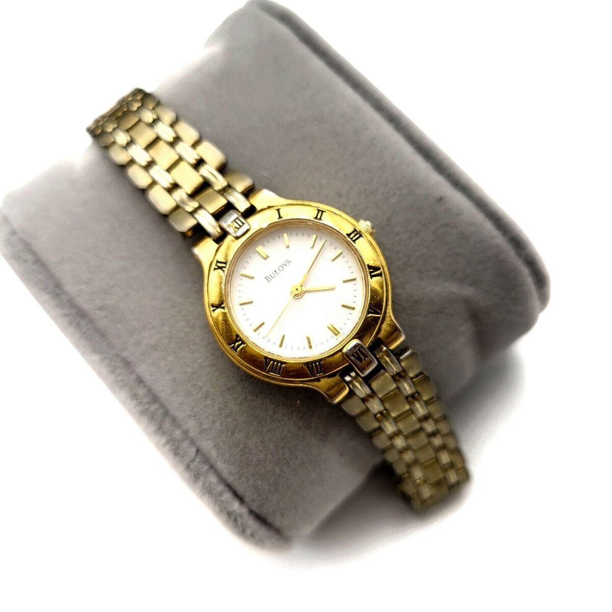 The Vintage 90's Bulova Quartz T9 Watch is a pre-owned women's wristwatch made in Japan. It features a round white dial with an analog display, gold bezel, and dark gold stainless steel band. The watch is water-resistant and has a brushed stainless steel case finish. It was manufactured between 1990-1999 and has a reference number of T9. The watch comes without papers or original box/packaging. It is a casual style watch with features such as water-resistance.