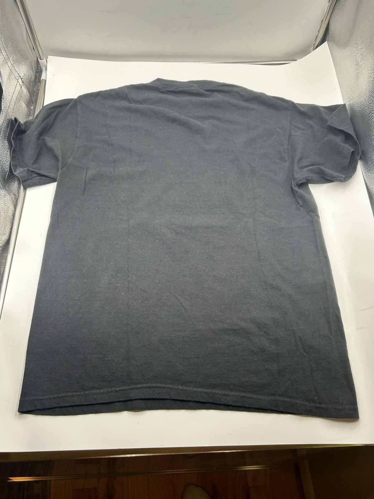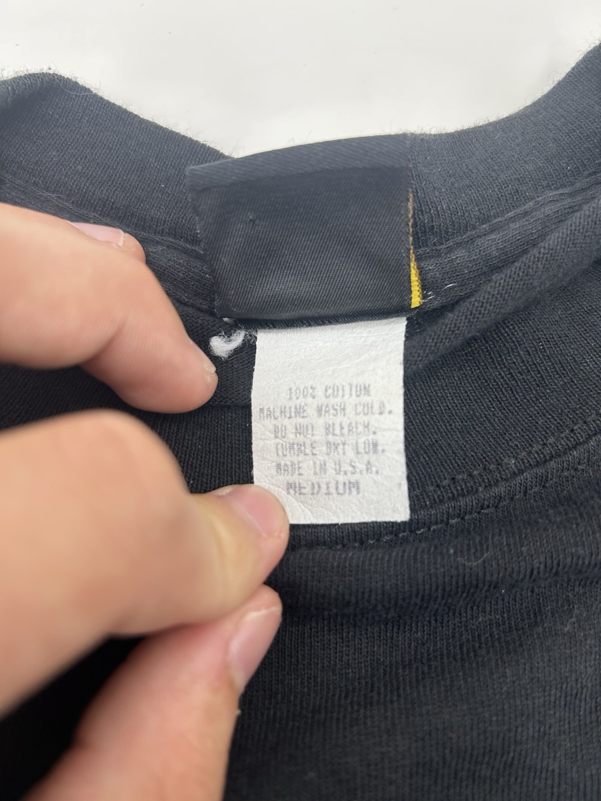 The Vintage 90s Cirque Du Soleil At Bellagio Art Tee Shirt in size Medium is a black graphic print t-shirt made of cotton. Featuring a crew neck and short sleeves, this regular fit shirt is perfect for all seasons and showcases a 90s theme with a design inspired by the iconic Cirque du Soleil brand. Made in the United States, this unique tee is a stylish addition to any man's wardrobe, suitable for both casual wear and special occasions.