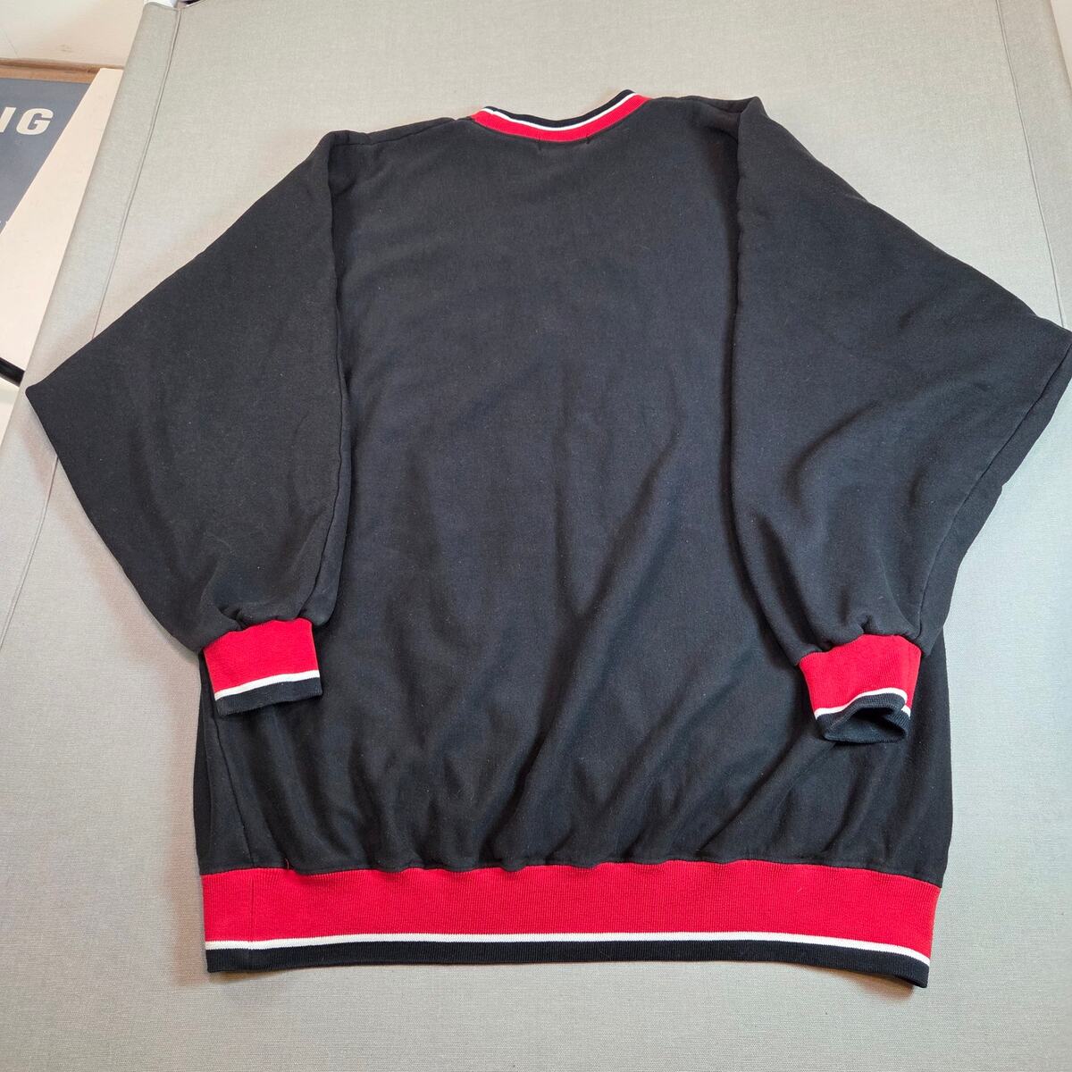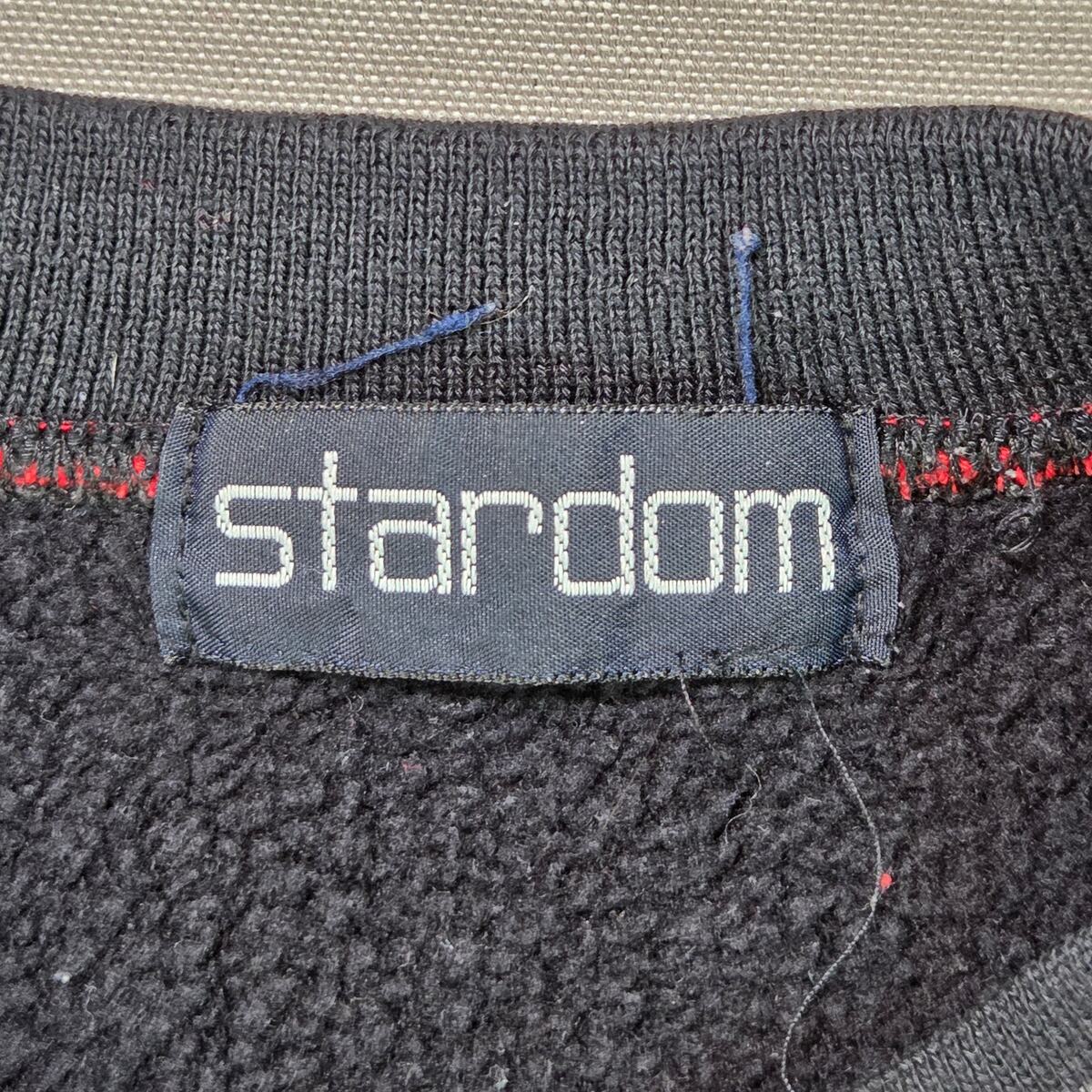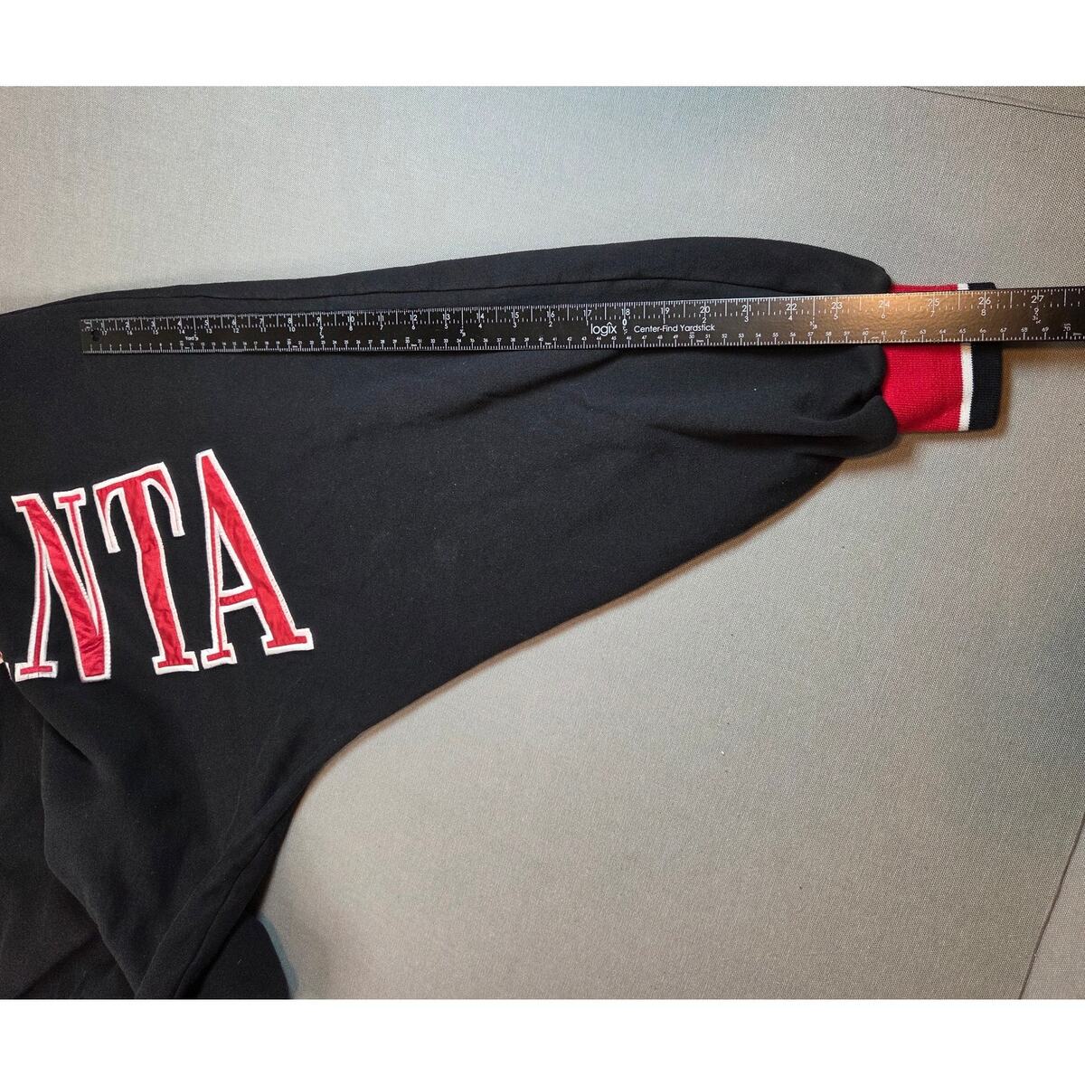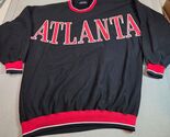 Vintage late-1990s Stardom ?ATLANTA? crewneck sweatshirt featuring bold raised tackle-twill stitched lettering across the chest. Heavy cotton loopback fleece interior and red-white ribbed trim give it a classic retro collegiate look. Oversized unisex fit with wide chest and dropped shoulders. Excellent pre-owned shape with no visible flaws or cracking.