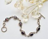 This vintage 925 sterling silver bracelet features natural garnet stones in an oval shape, set in a bezel setting. The link style bracelet has a toggle closure and contains 6 gemstones. With a beautiful color combination of silver and garnet, this piece exudes beauty and elegance, making it a stunning addition to any fine jewelry collection.