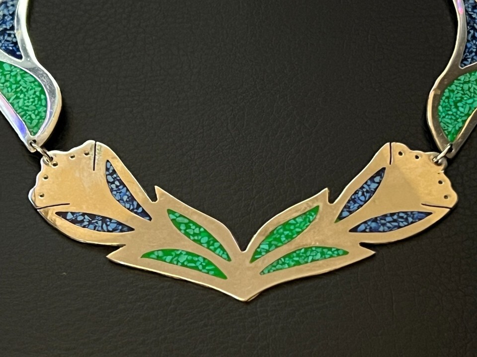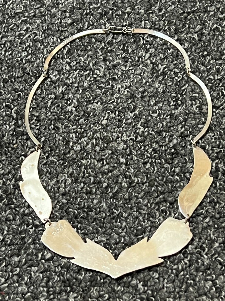 The item for sale is a vintage Vintage Alpaca Mexico Crushed Turquoise Gemstone Silver Necklace. In good used condition. Needs a good polishing to remove tarnishing.