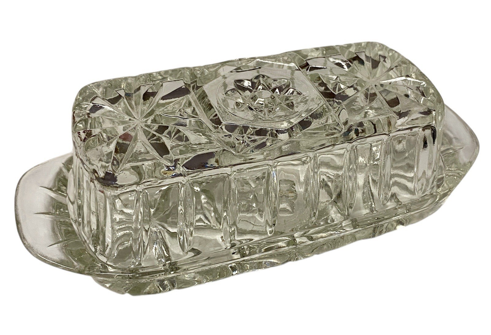 - Vintage Anchor Hocking Clear Pressed Cut Glass Covered Butter Dish Star Of David