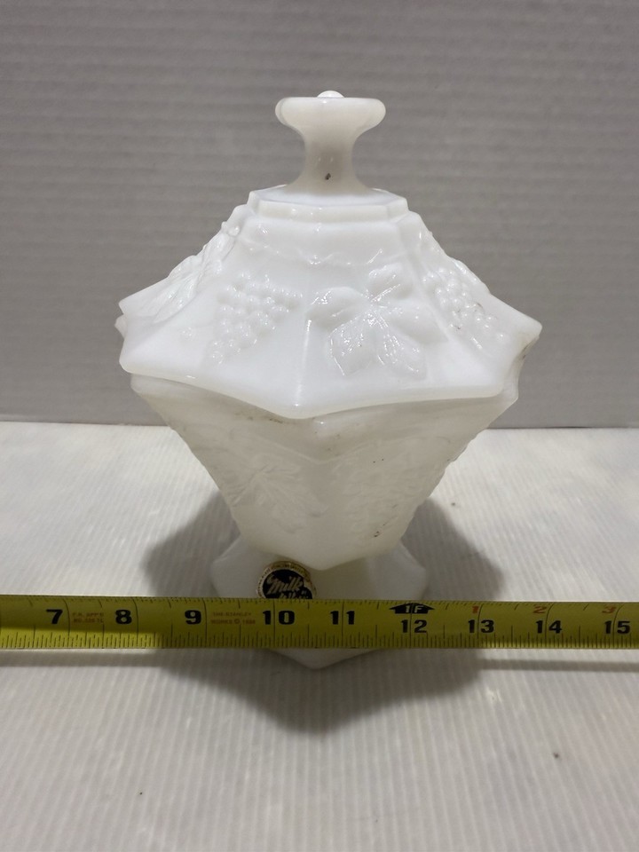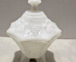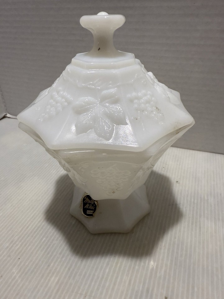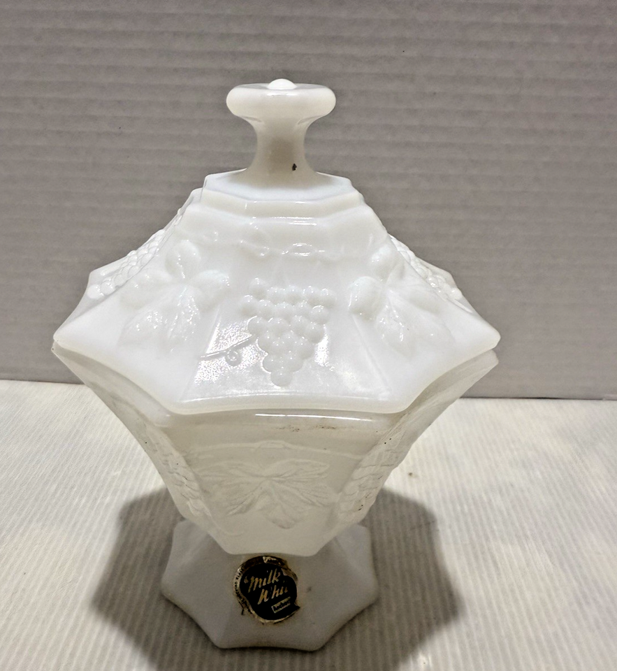 - Vintage Anchor Hocking White Milk Glass Grapes Footed Octagon Lidded Candy Dish