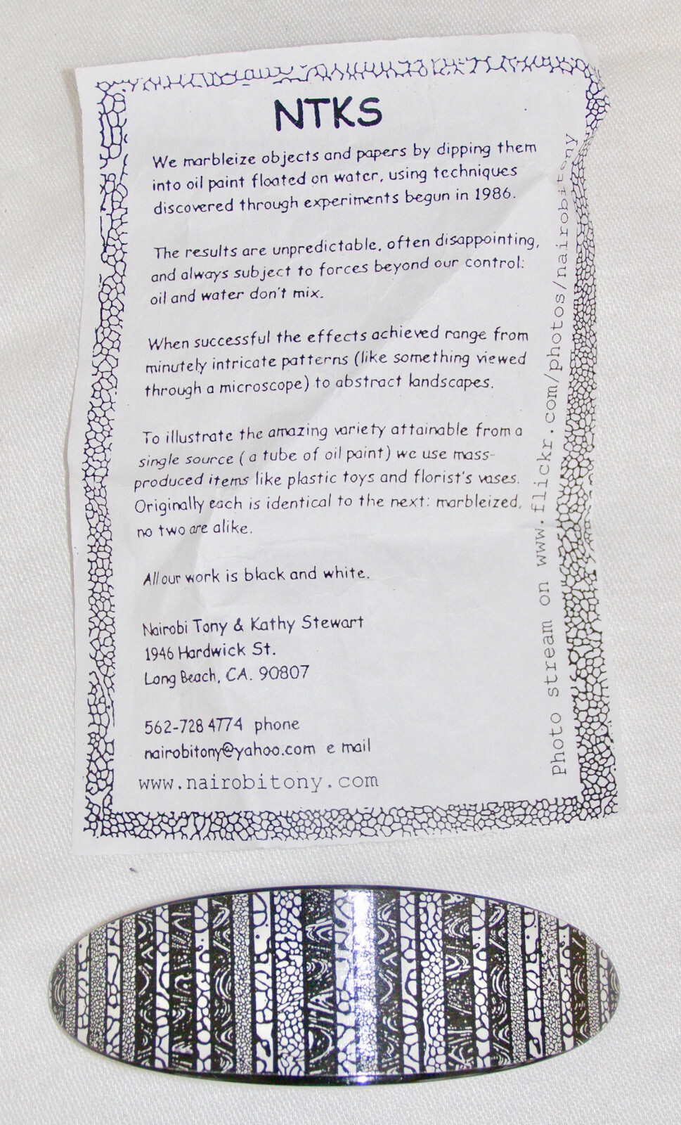VINTAGE ARTISAN MADE BLACK & WHITE MARBLEIZED RESIN HAIR BARRETTE BY “NTKS”, CA