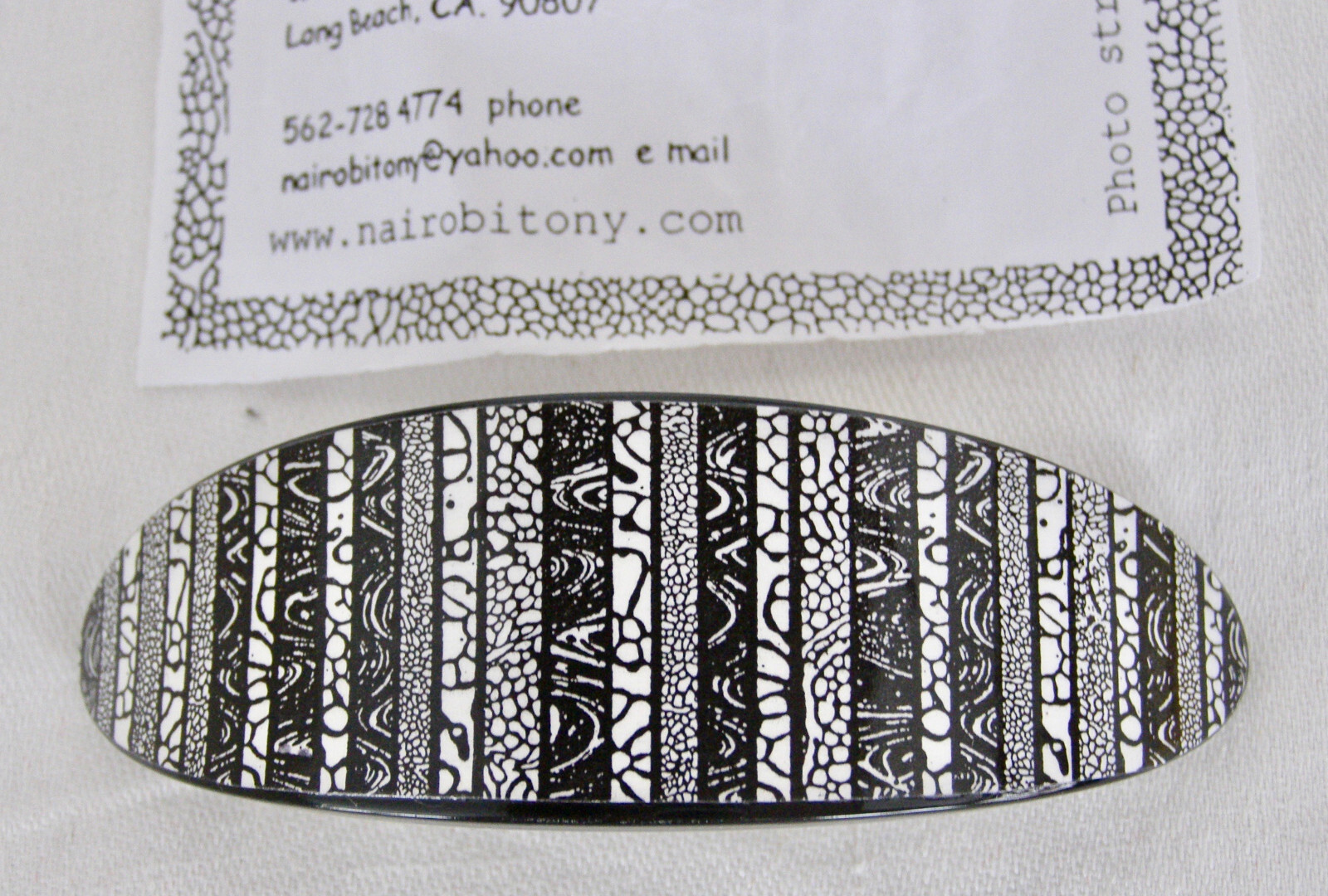 - VINTAGE ARTISAN MADE BLACK & WHITE MARBLEIZED RESIN HAIR BARRETTE BY “NTKS”, CA