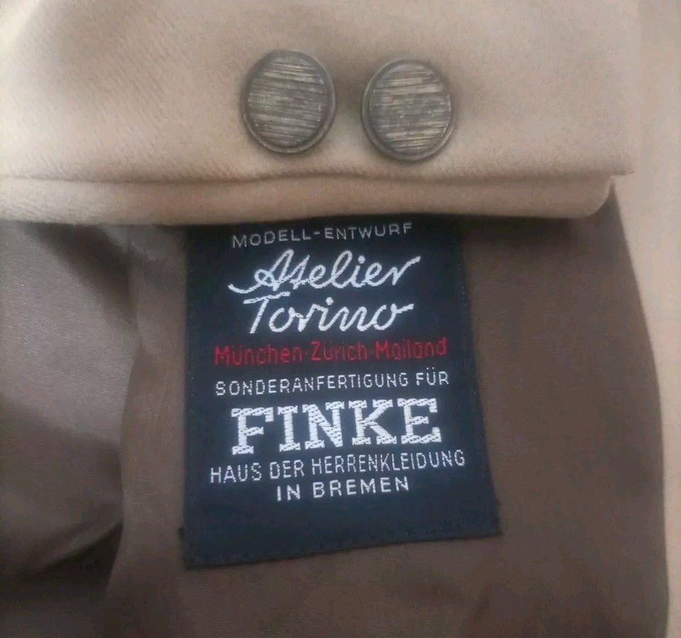 This is your chance to own a piece of tailoring history! This vintage label from Atelier Torino signifies a garment custom-made for Finke, a renowned men's clothing store in Bremen, Germany. Atelier Torino was celebrated for its exceptional craftsmanship and had locations in Munich, Zurich, and Milan.