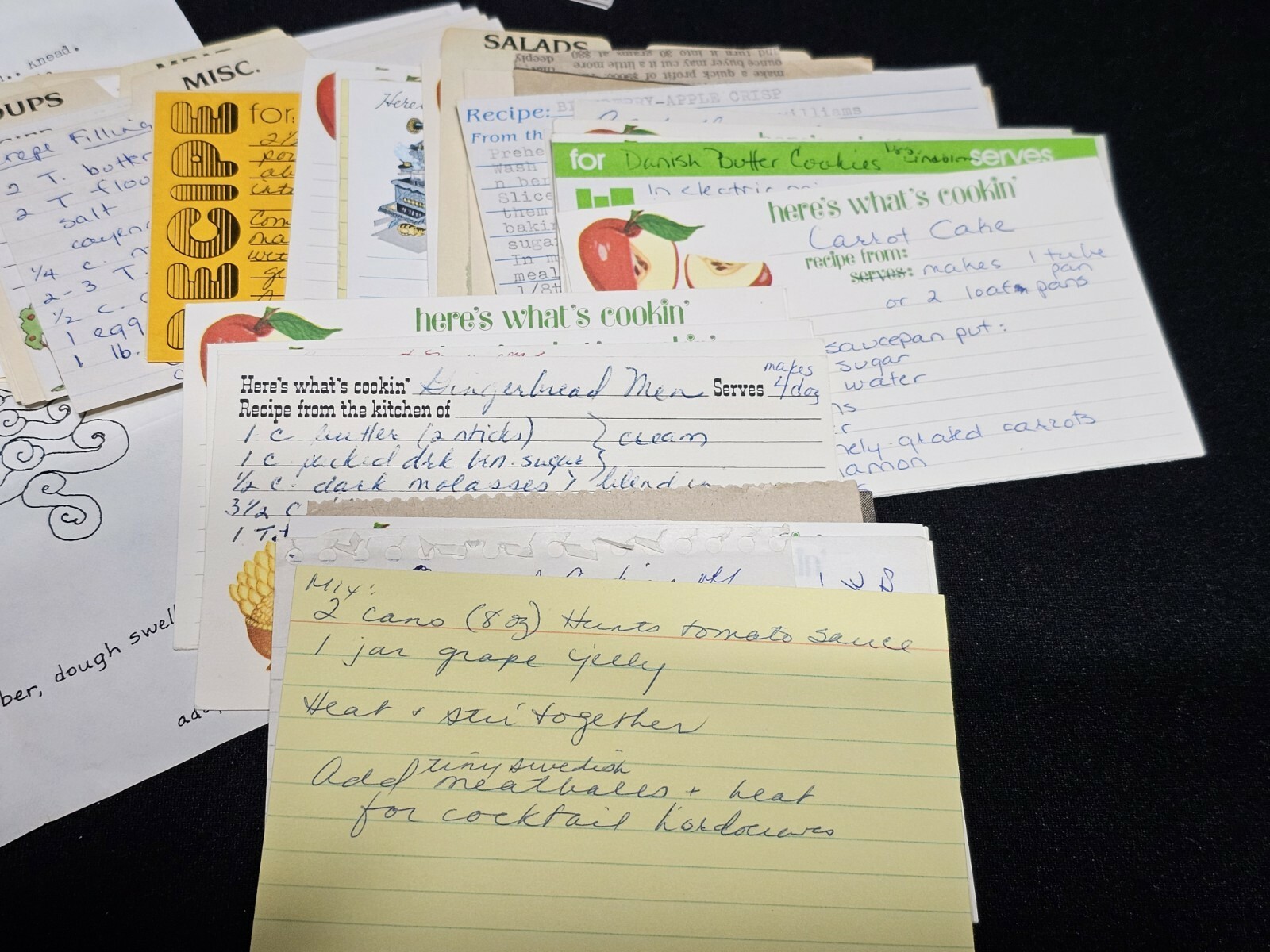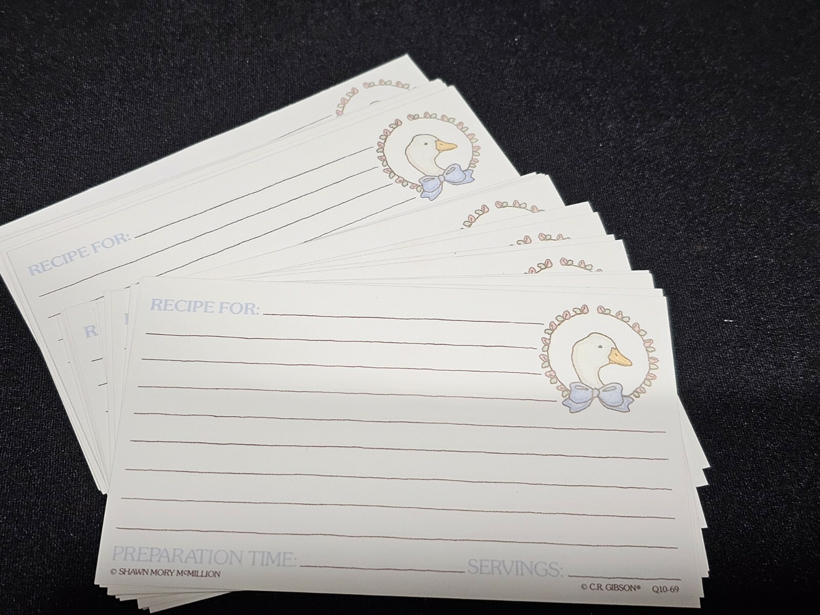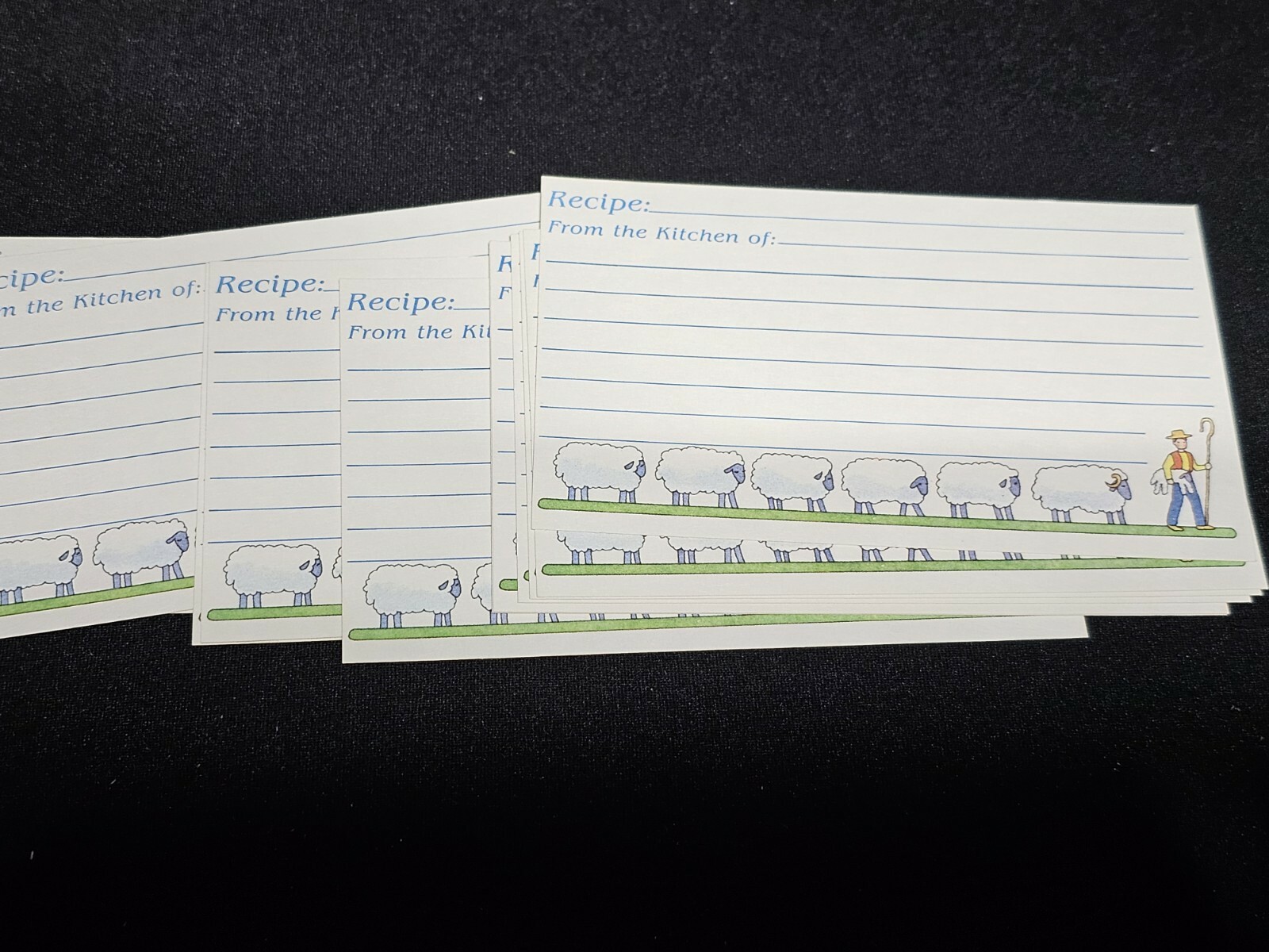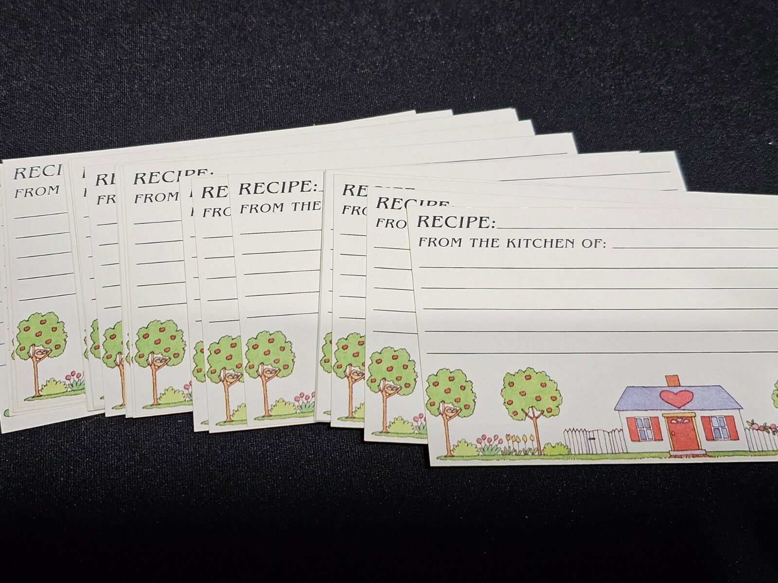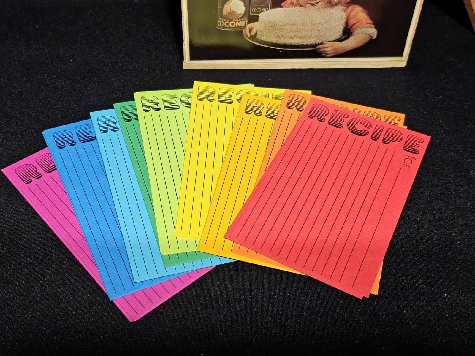 Condition: Very good vintage condition. Box is sturdy with visible aging/patina. Recipes are in used/pre-loved condition with some discoloration and wear, adding to their charm.