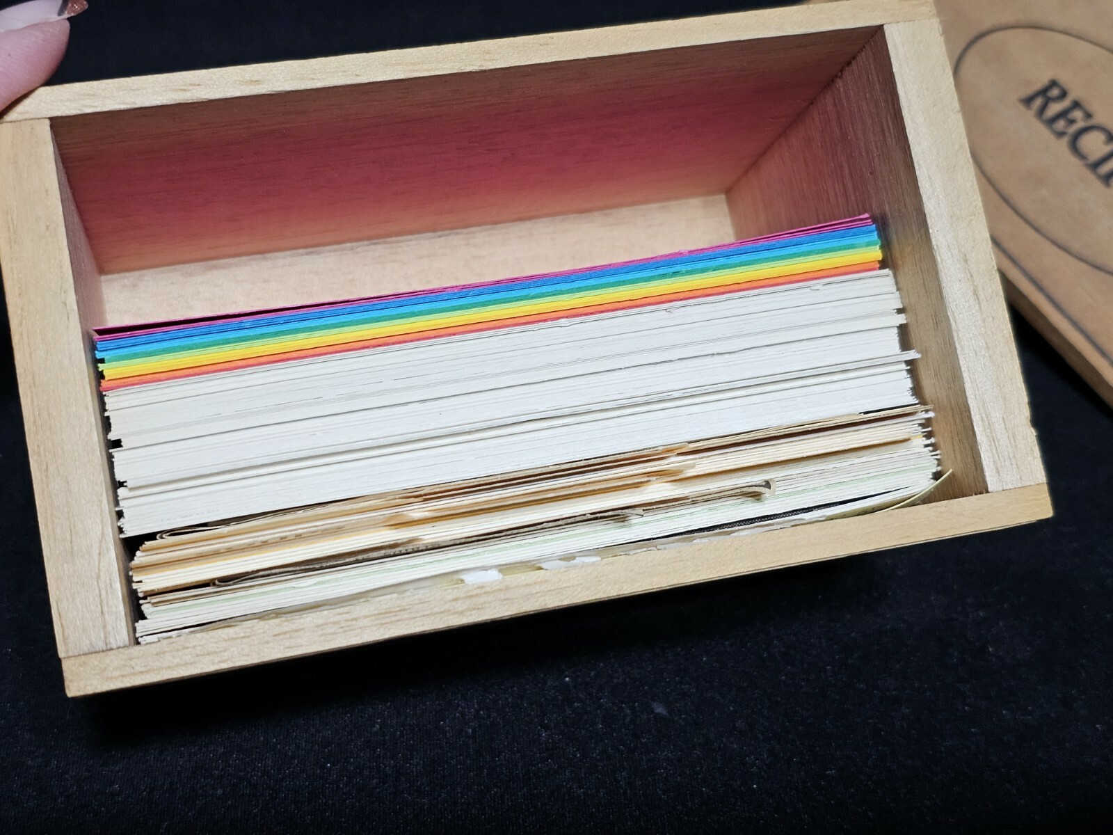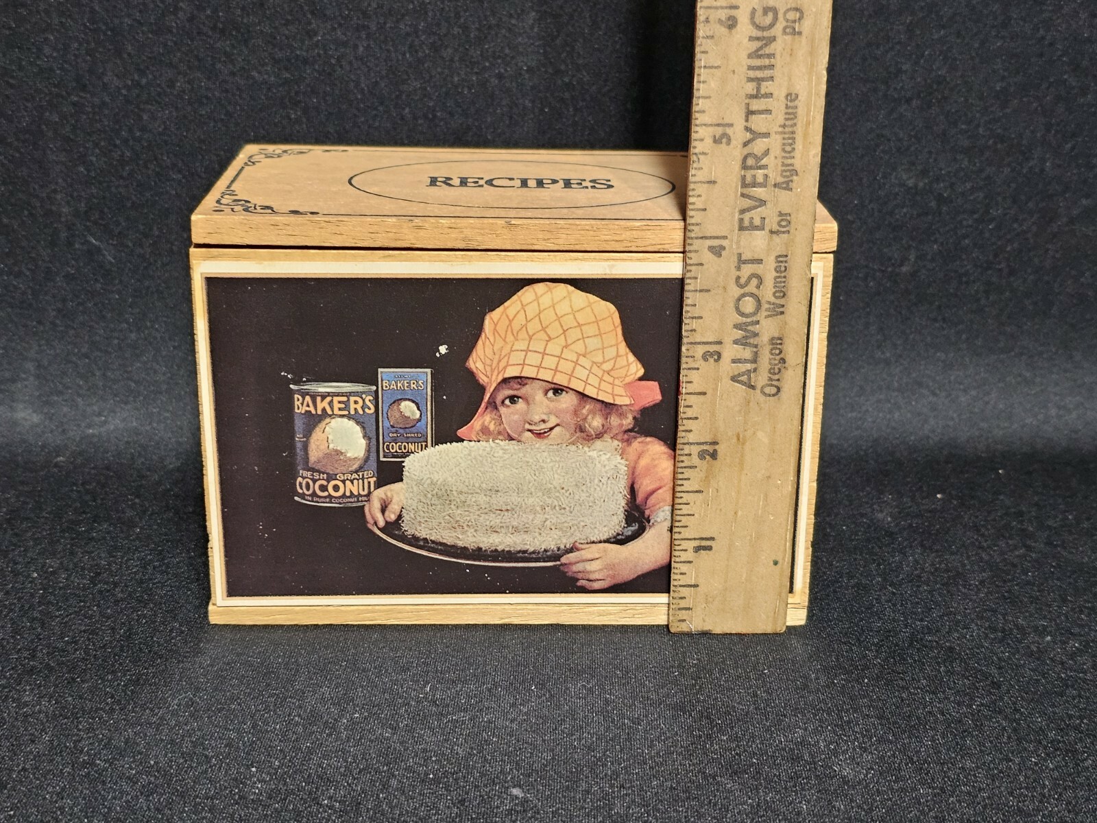 - Vintage Bakers Coconut Wooden Recipe Box w/Handwritten Recipes Blank Cards 1980s