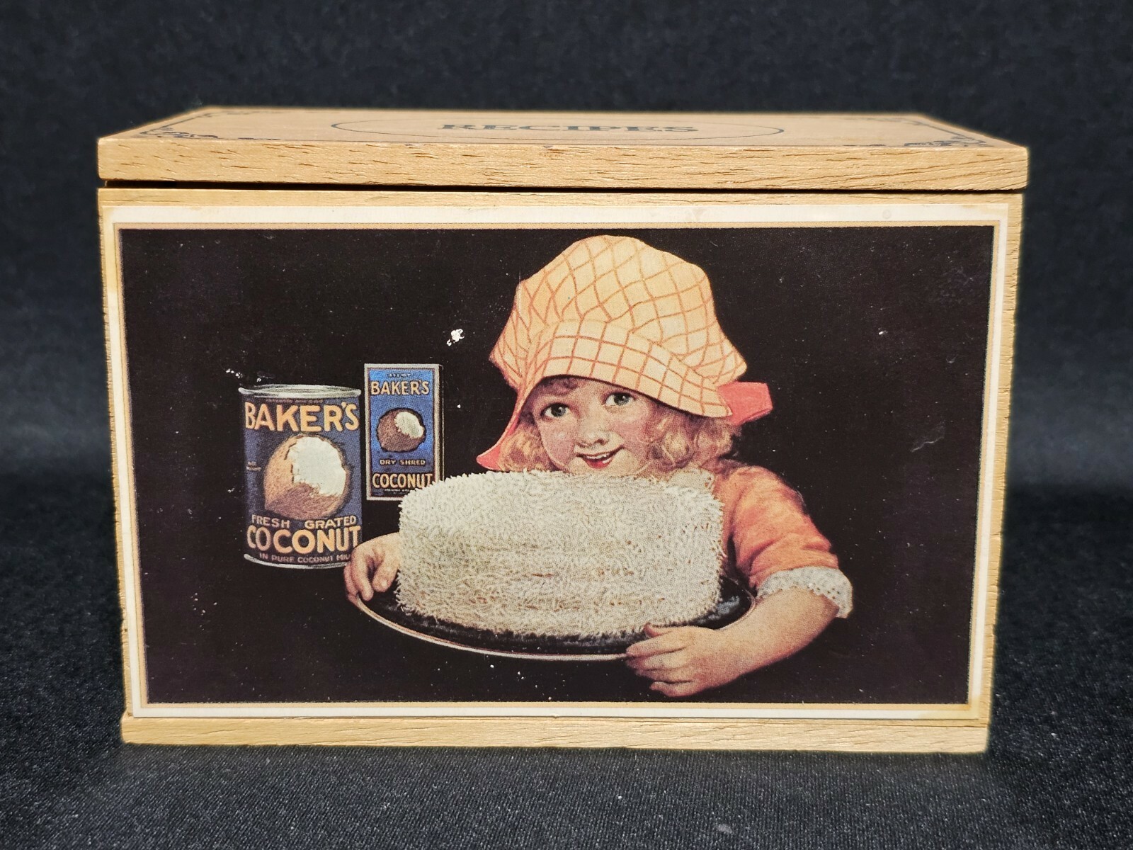 Step back into a retro kitchen with this vintage Baker?s Coconut wooden recipe box, complete with a charming collection of handwritten recipes, vintage printed cards, and a variety of blank index cards ready for new favorites.