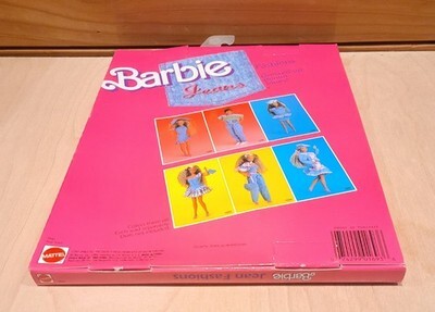 The Vintage Barbie Fashion Jeans Outfit from 1988 by Mattel includes a one-shoulder dress, shoes, and accessories such as a purse. This pink and denim outfit is part of the Barbie Jeans Fashions product line and is designed for a 11.5 inch fashion doll. The set exudes a retro charm with its 1980s style, perfect for collectors or Barbie enthusiasts looking to add a nostalgic touch to their doll wardrobe. Made from cloth and plastic, this original set is a must-have for fans of vintage Barbie fashion.