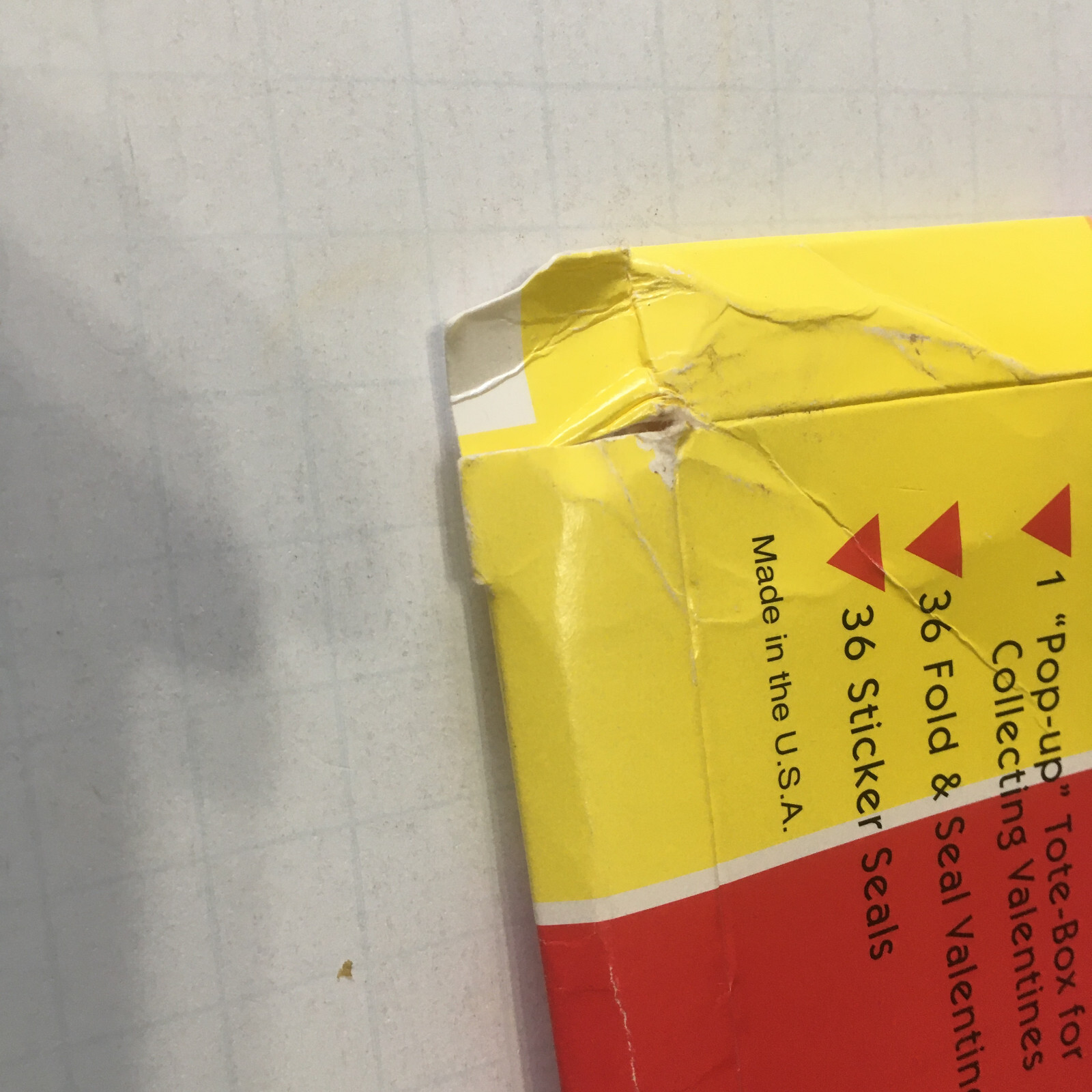 Preowned used condition empty opened smashed box with 3 uncut small Valentine cards on back