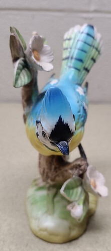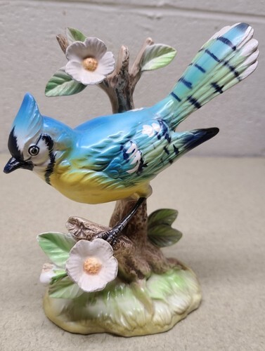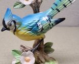 - Vintage Beautiful Ceramic Blue Jay Bird On Branch Figurine Hand Painted - 5x3x6"