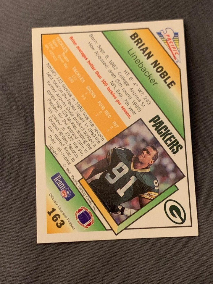 Celebrate a legendary Packers defender with this Brian Noble Pacific Football Card. A key figure in the Green Bay Packers? defensive lineup during the 1980s and early 1990s, Noble was known for his tenacity and leadership on the field. This vintage NFL trading card is a must-have for any serious collector or Green Bay fan.