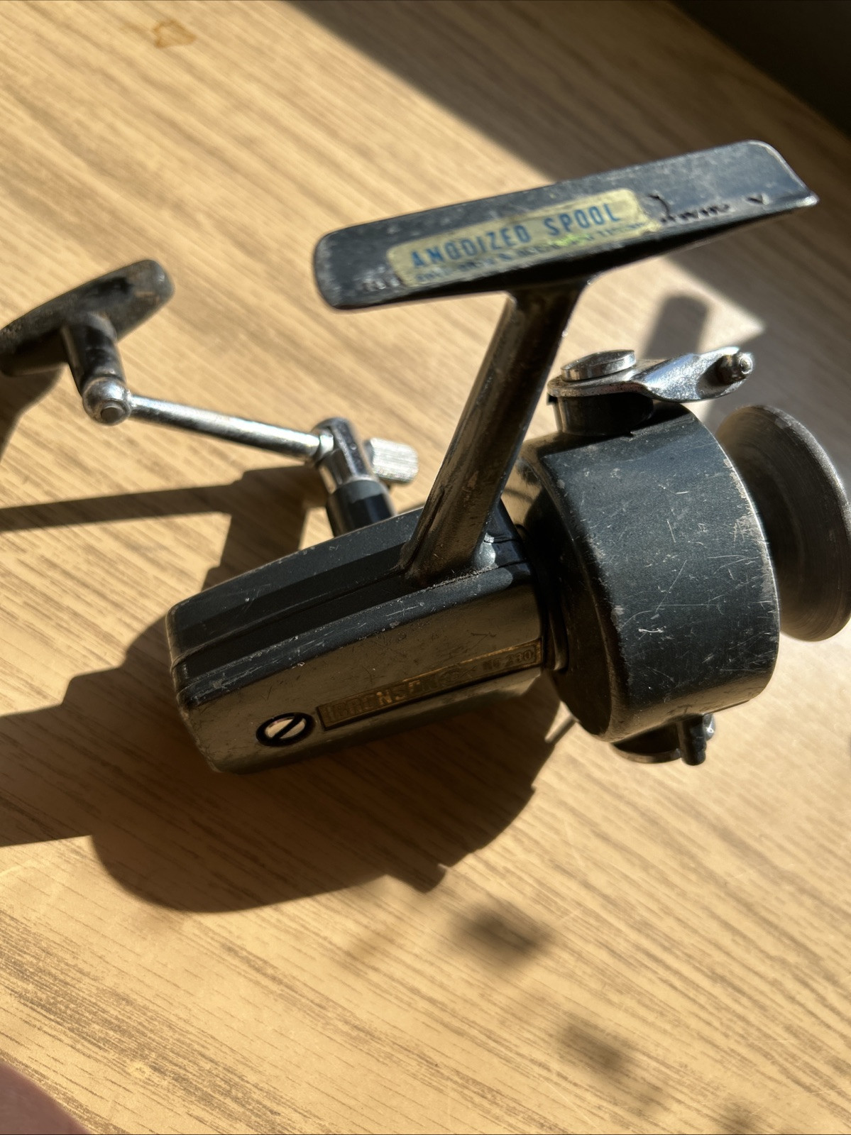 Vintage Bronson No. 230 Spinning Reel, Blue in Color, Anodized spool, Reel is in overall good condition both Mechanically and Cosmetically.