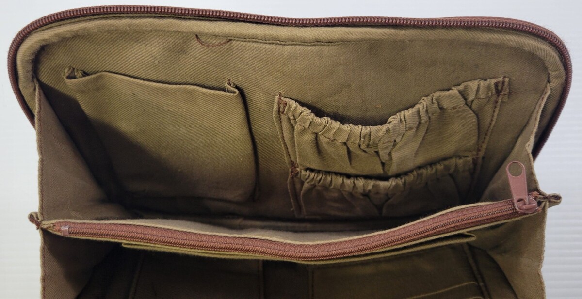 Bag is in fairly good vintage used condition. The inner lining has some marks of age and use. The outside is in better condition and overall good shape. There is a one strip of the outer pocket closure missing with some remaining glue residue.