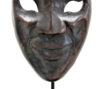 This vintage carved black wooden comedy/tragedy mask wall or stand sculpture is a unique and handmade piece of folk art. The medium-sized sculpture features intricate carving details on a wooden base, making it a striking addition to any art collection. With its contemporary design and original production technique, this mask sculpture captures the essence of masks and their symbolic themes in a beautifully crafted form. Perfect for those who appreciate traditional artistry and artisanal pieces.