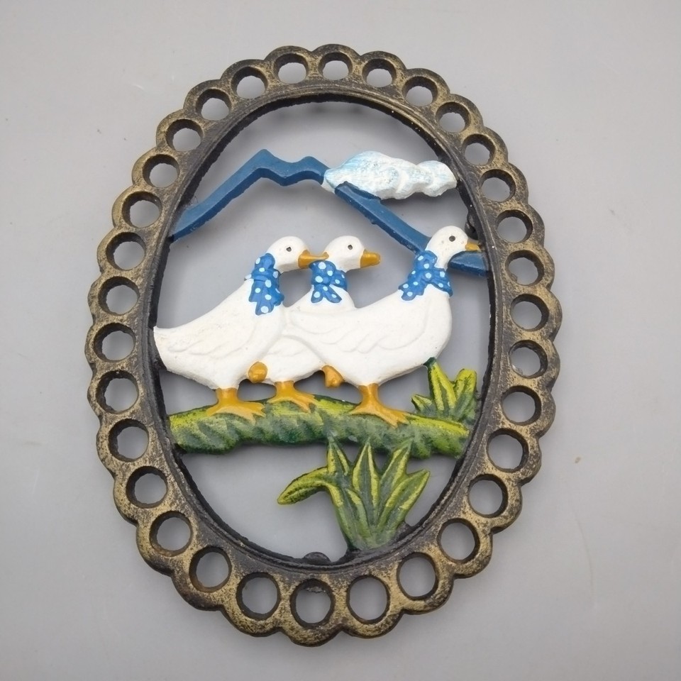 - Vintage Cast Iron Farm Ducks Trivet Hand Painted Oval 8.5” Geese Cottagecore