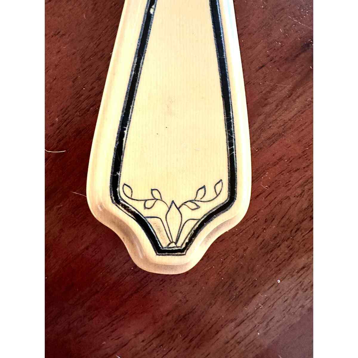 The mirror measures 11" long and has a round light stain on the back, and beveled mirror side is slightly cloudy but clear to see reflection. The brush is a little over 9" long, boar bristles. Both have a pretty black Art Deco floral detail but its worn in places. They are in good condition, not perfect, but perfectly used.LOVE RETRO!