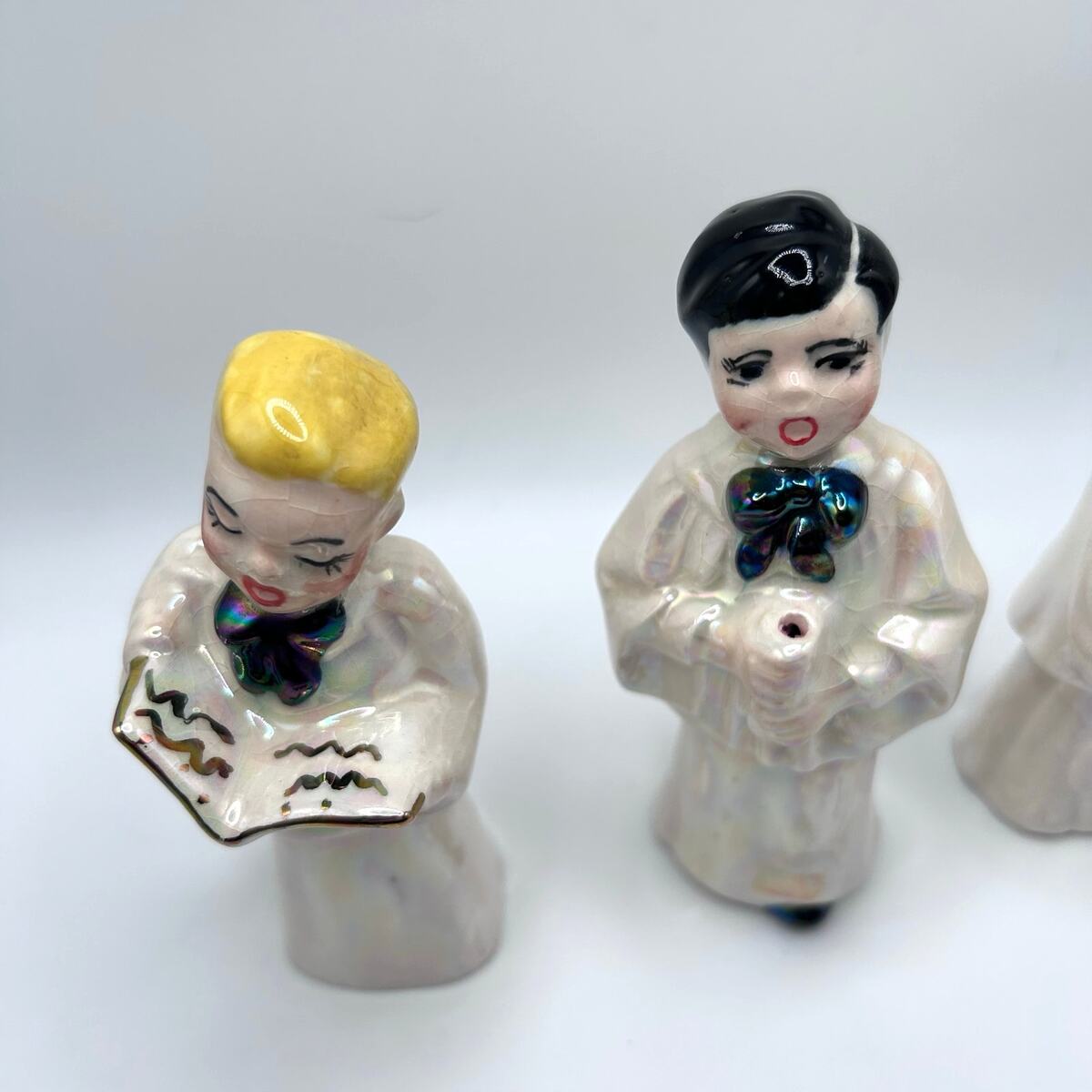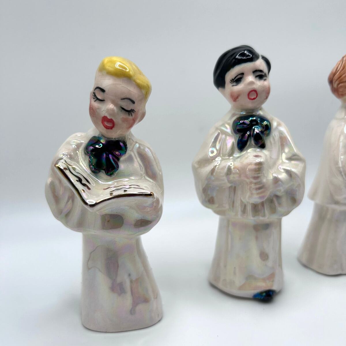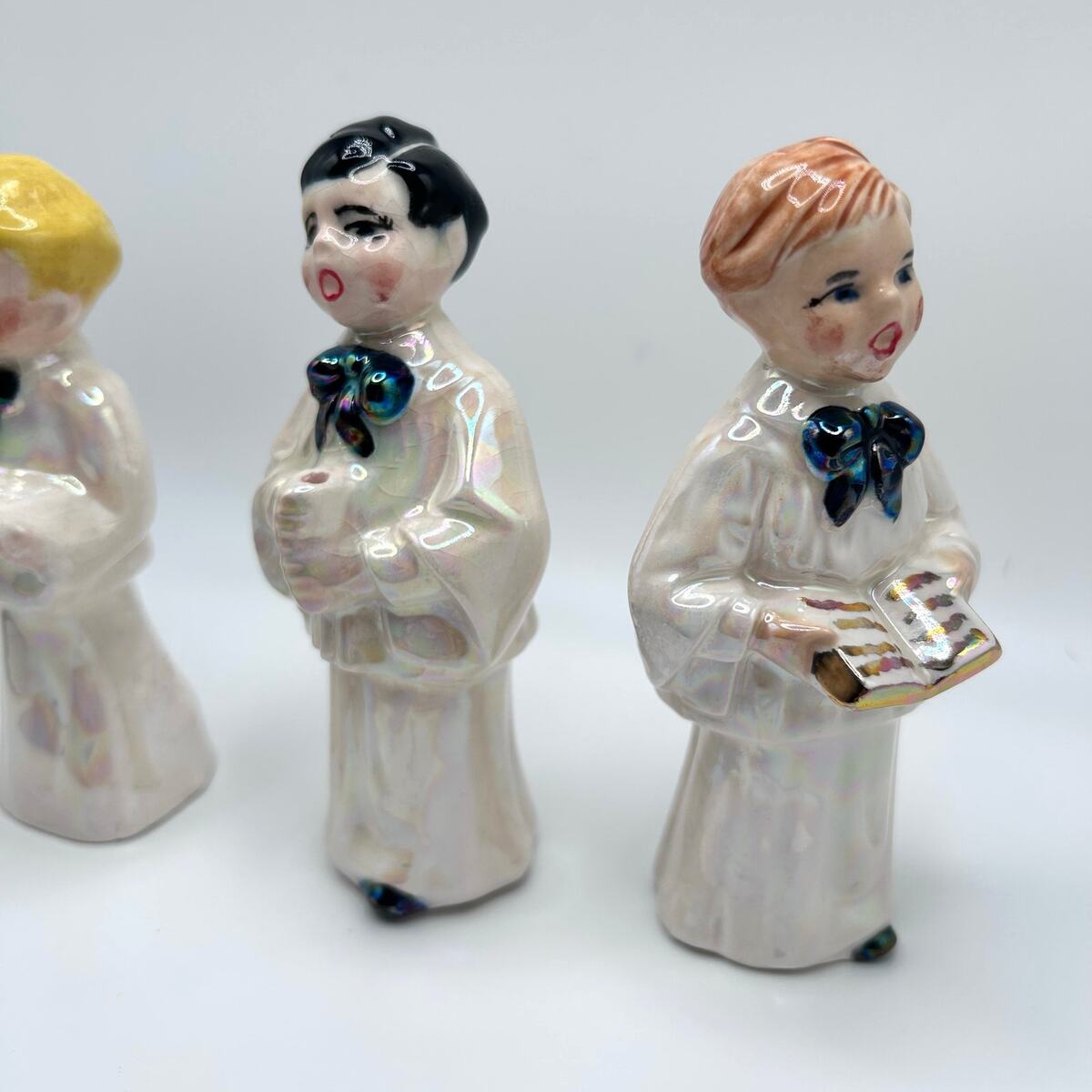 vintage christmas, ceramic figurines, choir boys, caroler set, holiday decor, christmas figurines, vintage holiday, mantle decor, nostalgic decor, iridescent glaze, hobbyist ceramic, christmas display, vintage choir, holiday collectible