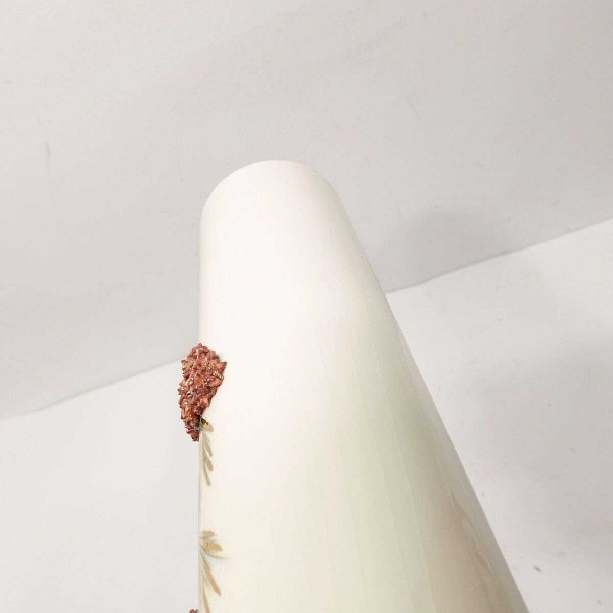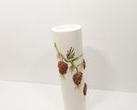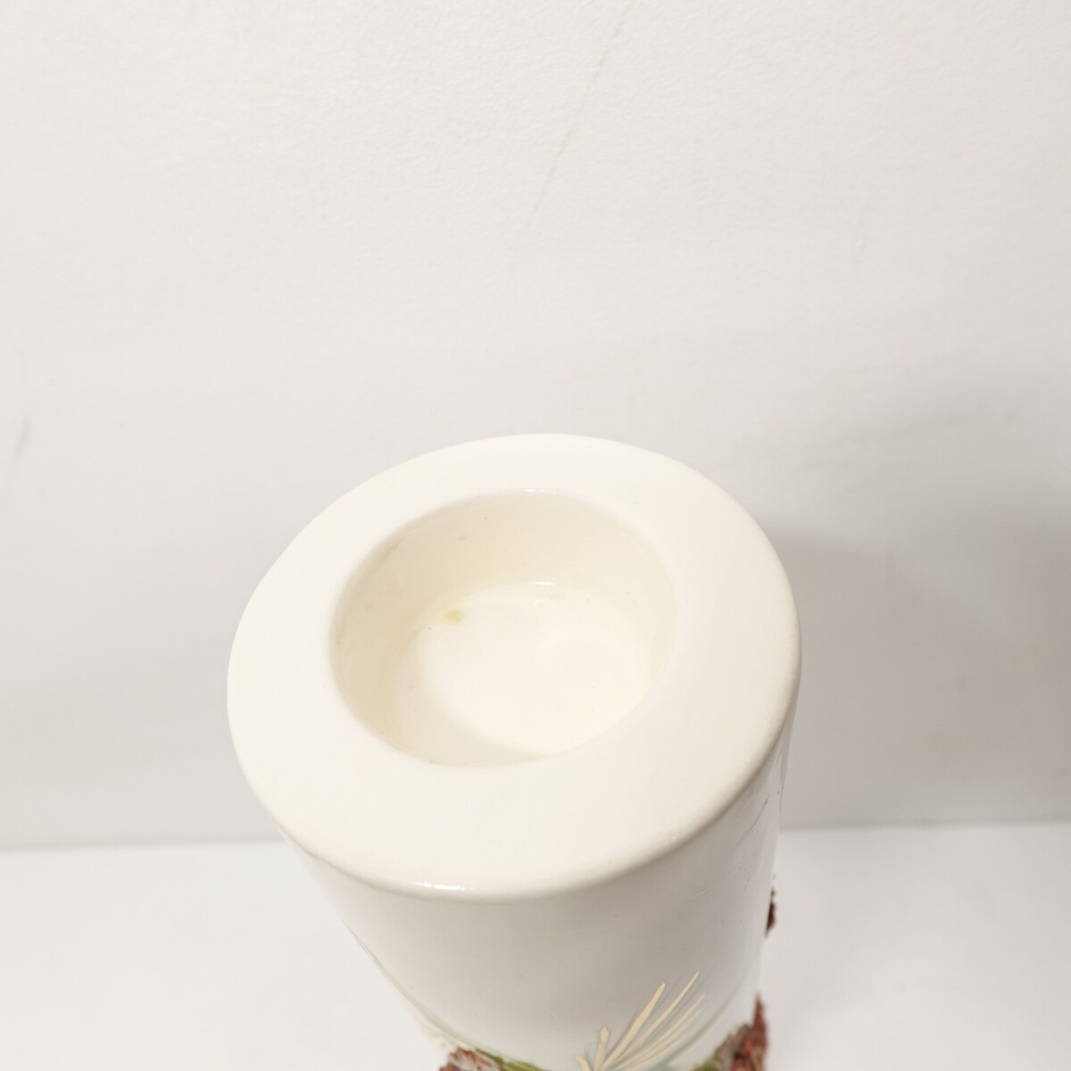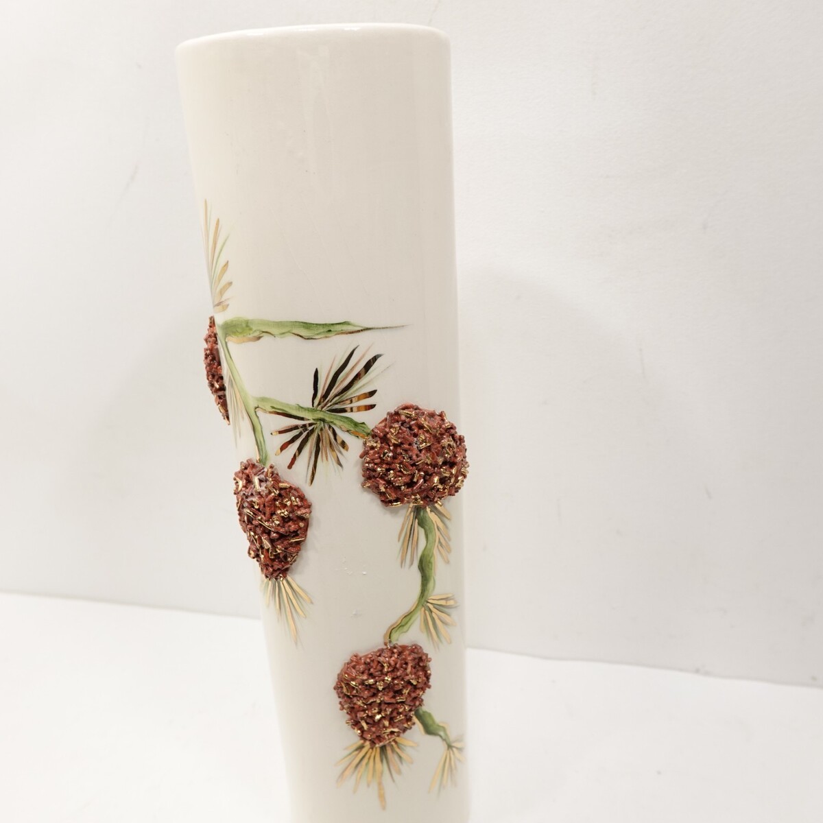 Beautiful vintage ceramic vase featuring a hand-painted pine branch and pinecone motif with raised textured detailing. The creamy off-white glaze gives it a rustic, woodland charm perfect for cabin or lodge decor.