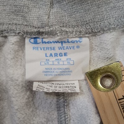 This product is a vintage pair of Champion Thunder Wrestling men's gray graphic joggers pants in size L with a waist size of 30 inches. Made from cotton canvas fabric, these sweatpants feature a drawstring closure, straight leg style, and a comfortable fit. Perfect for travel, activewear, casual, or workwear occasions, these pants also offer easy care and convenient pockets. The Champion Authentic product line ensures quality and style that is both timeless and on-trend, making these joggers a versatile and stylish addition to any wardrobe for all seasons.