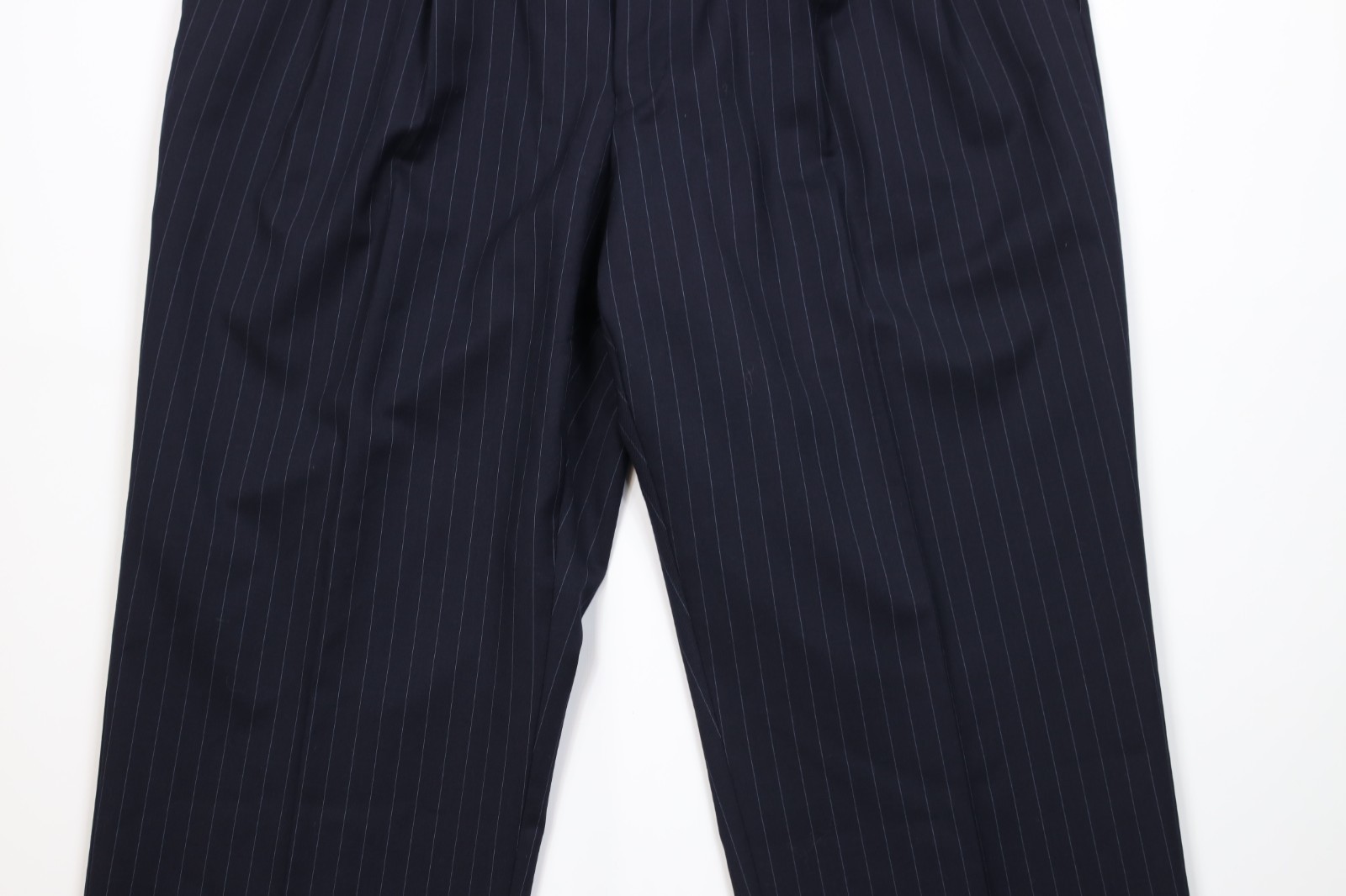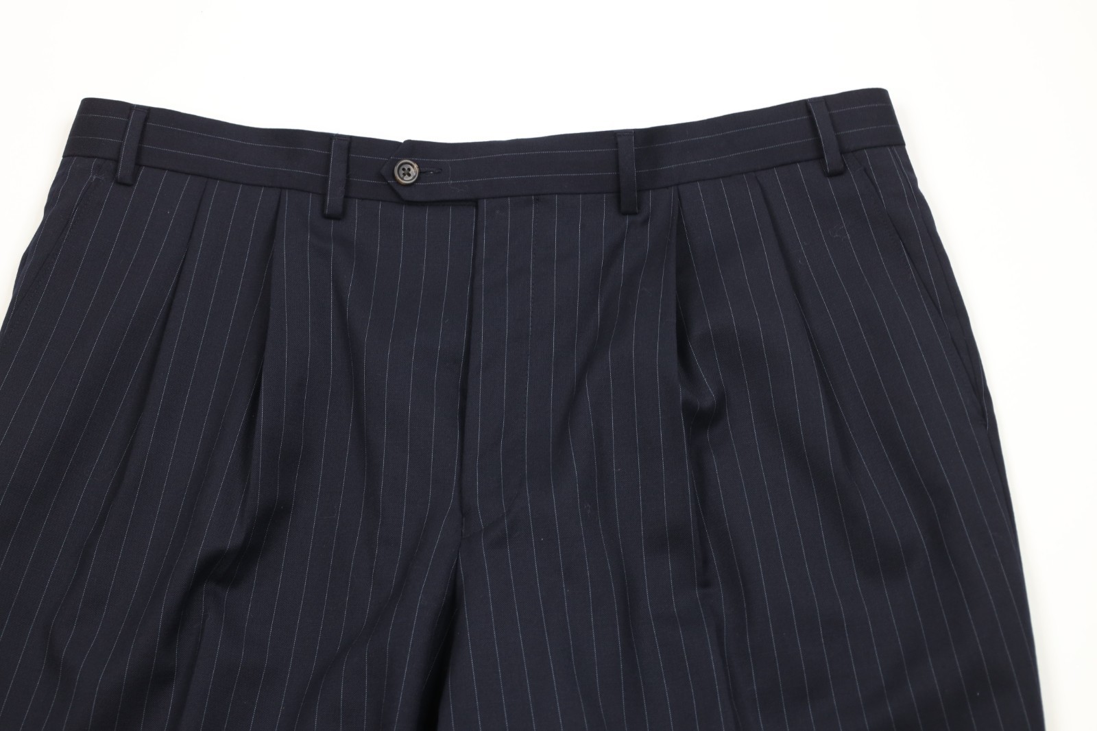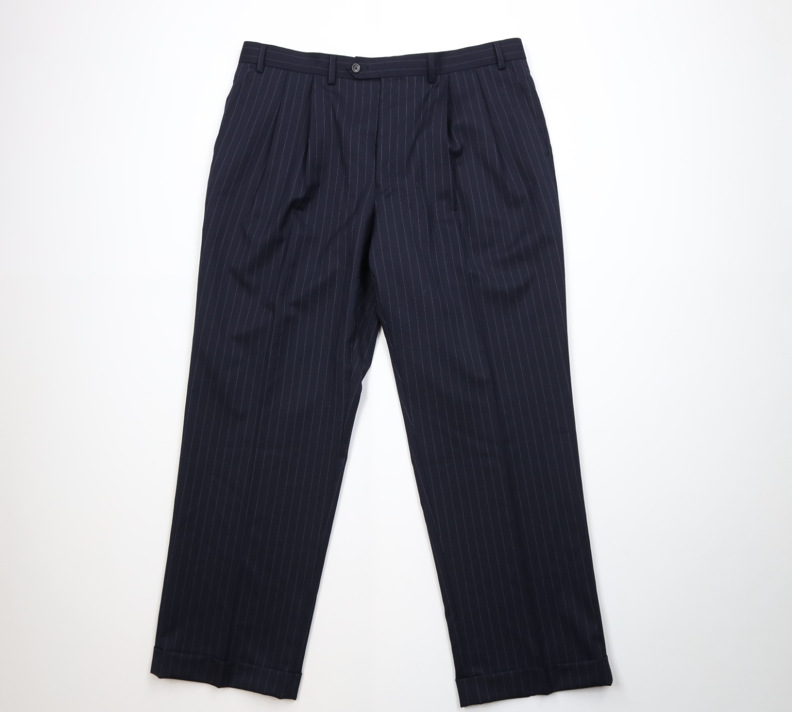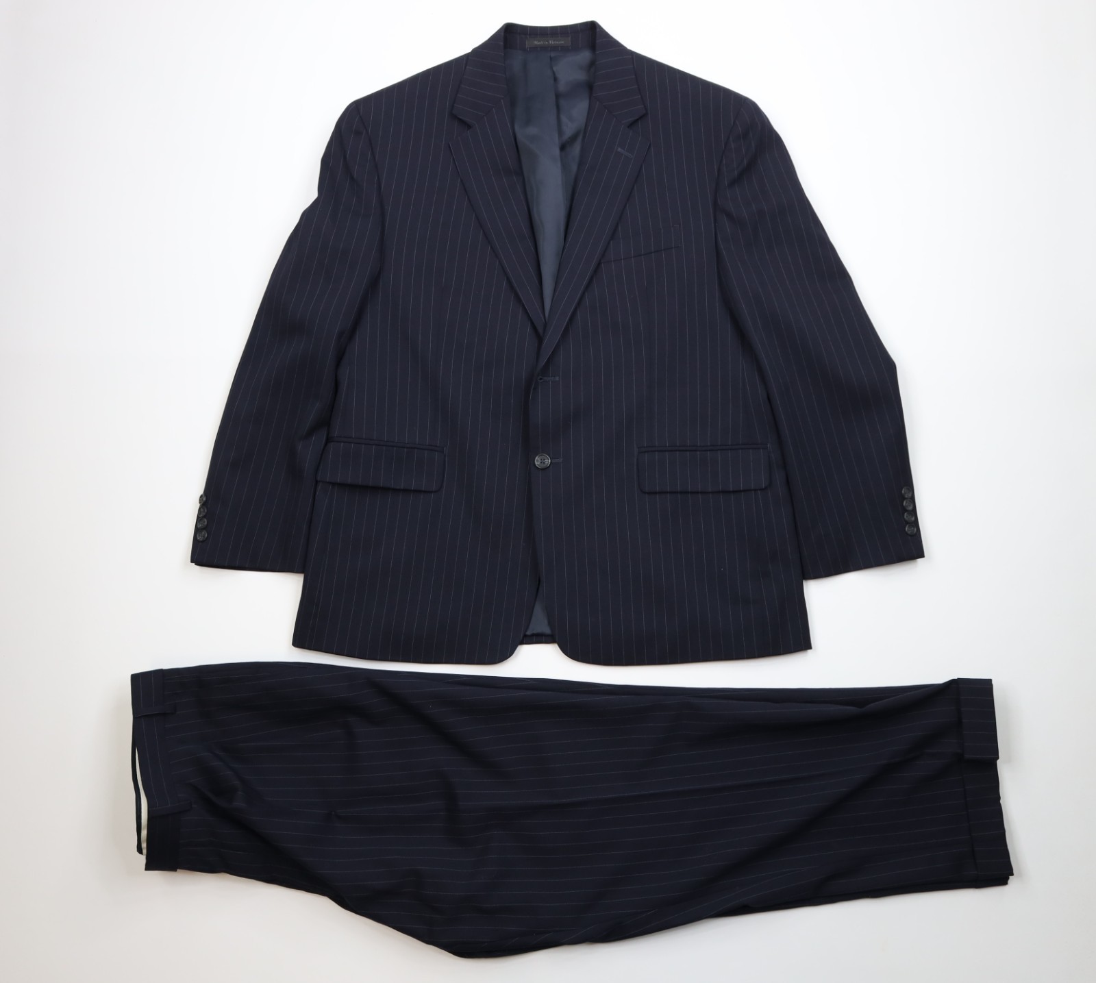 - Vintage Chaps Mens 44S 2 Piece Wool Pinstriped Suit Wedding Navy Blue 38x30