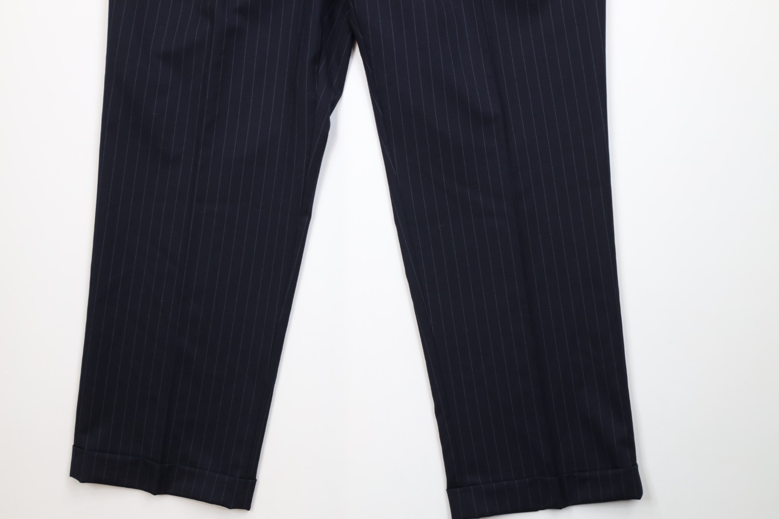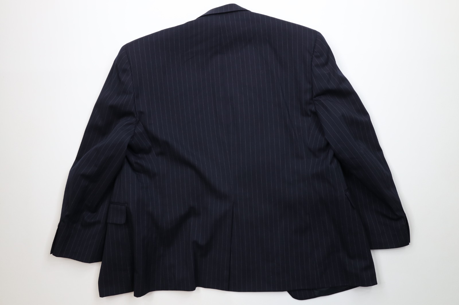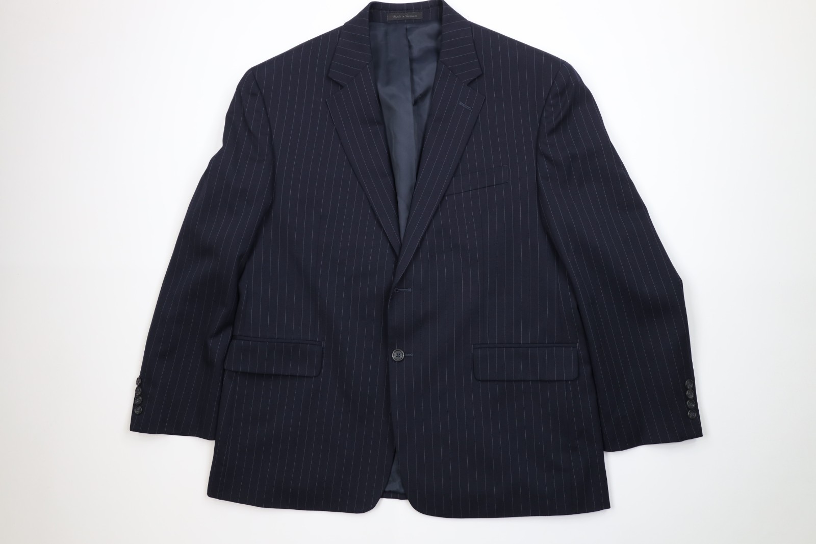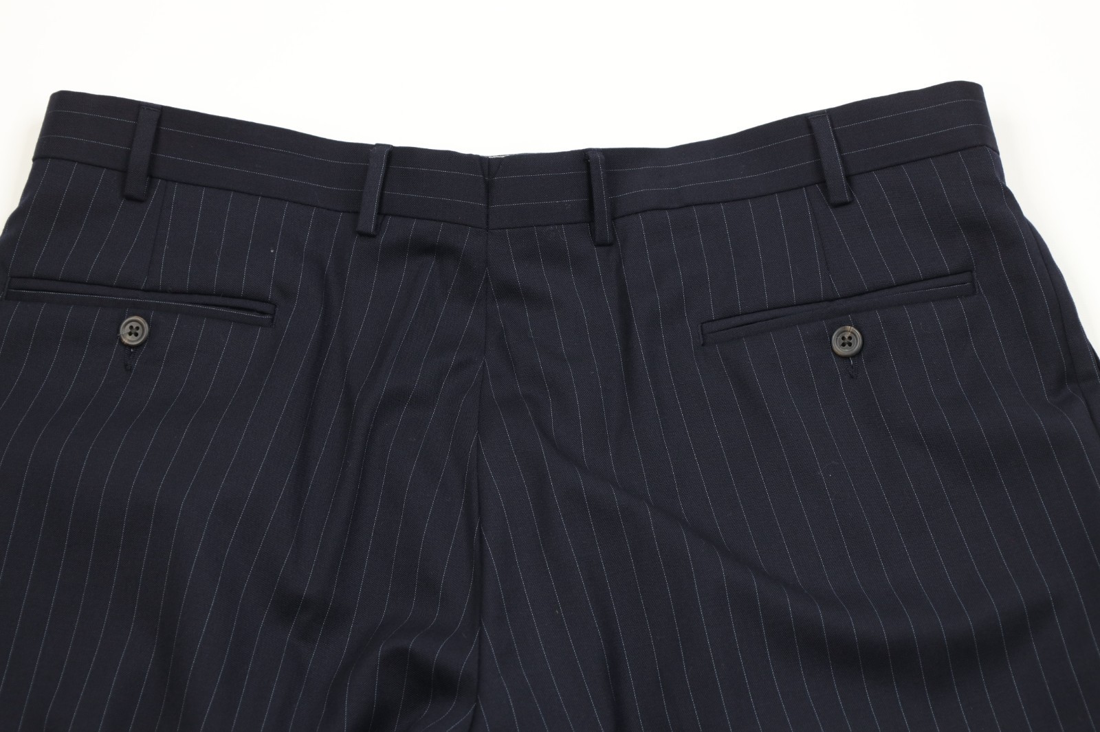 - Vintage Chaps Mens 44S 2 Piece Wool Pinstriped Suit Wedding Navy Blue 38x30