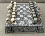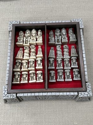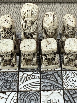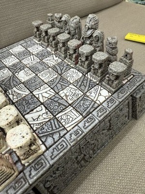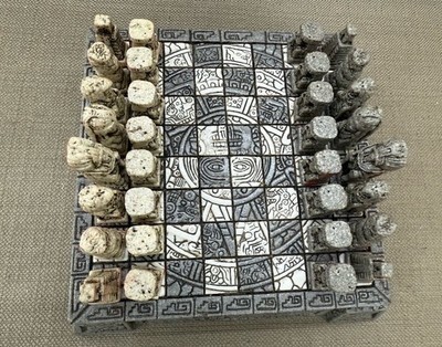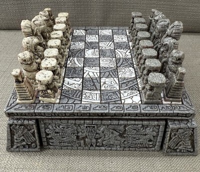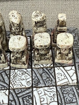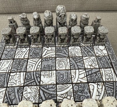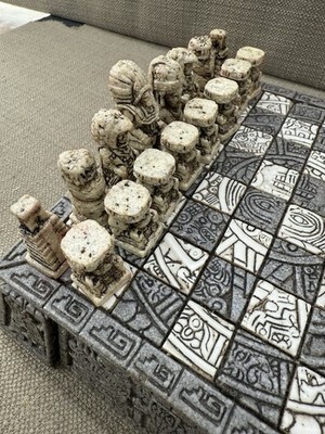 10m. Vintage Aztec Mayan Stone Chess Set Carved Board w/ Figurine Pieces 8? Boxed